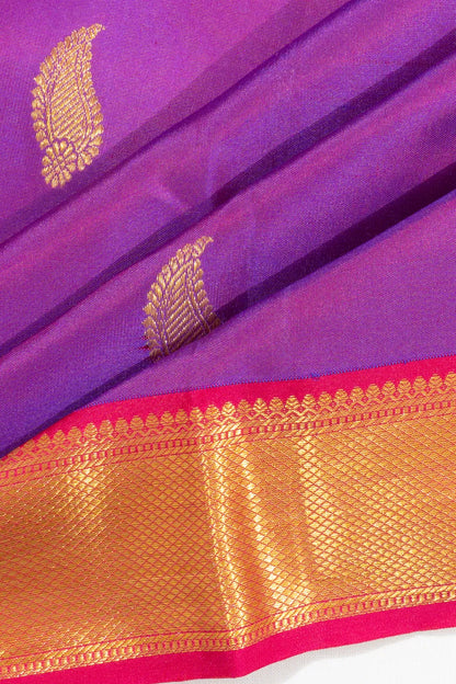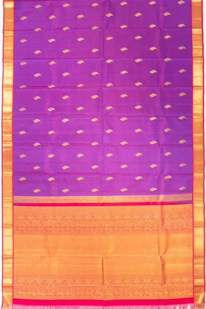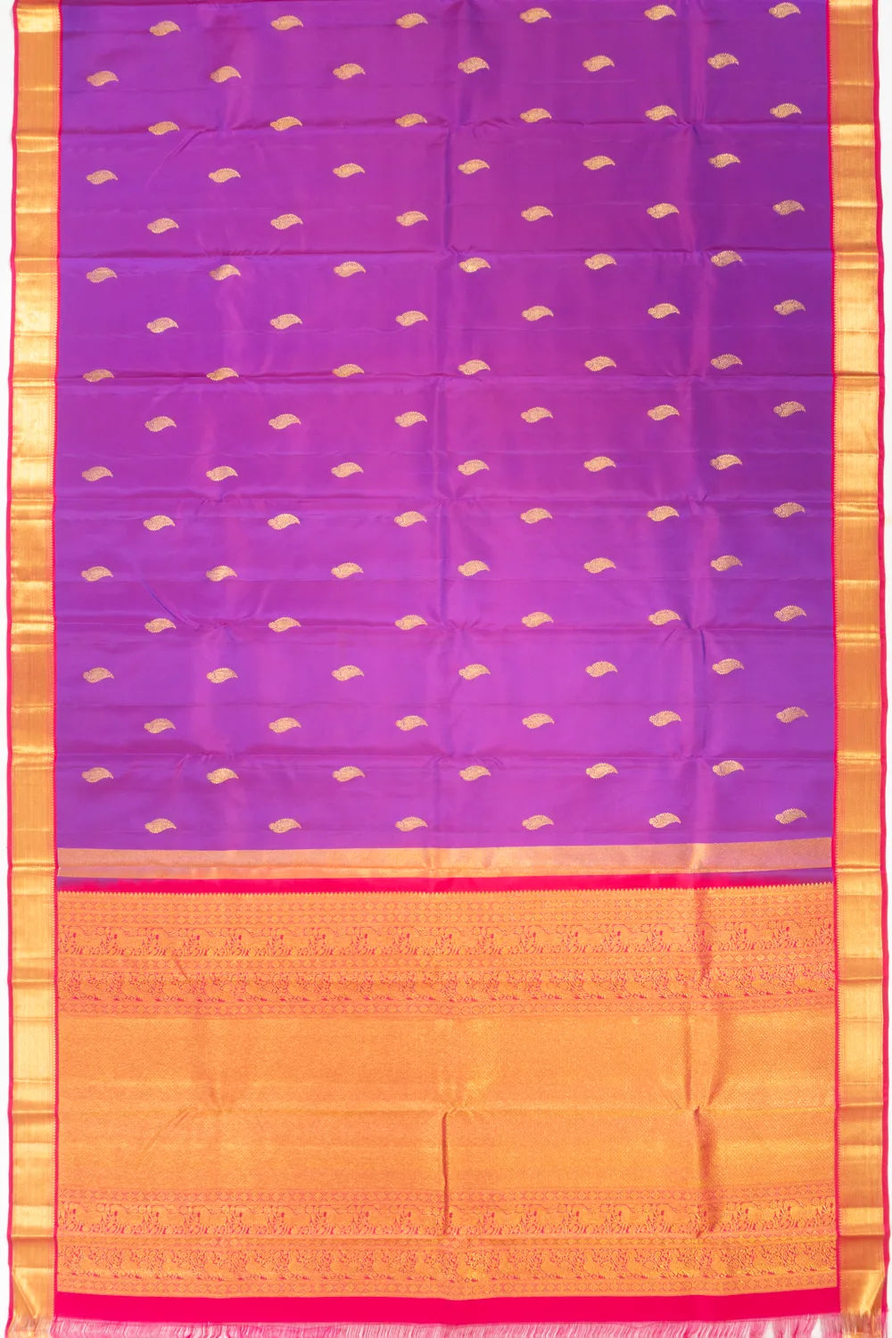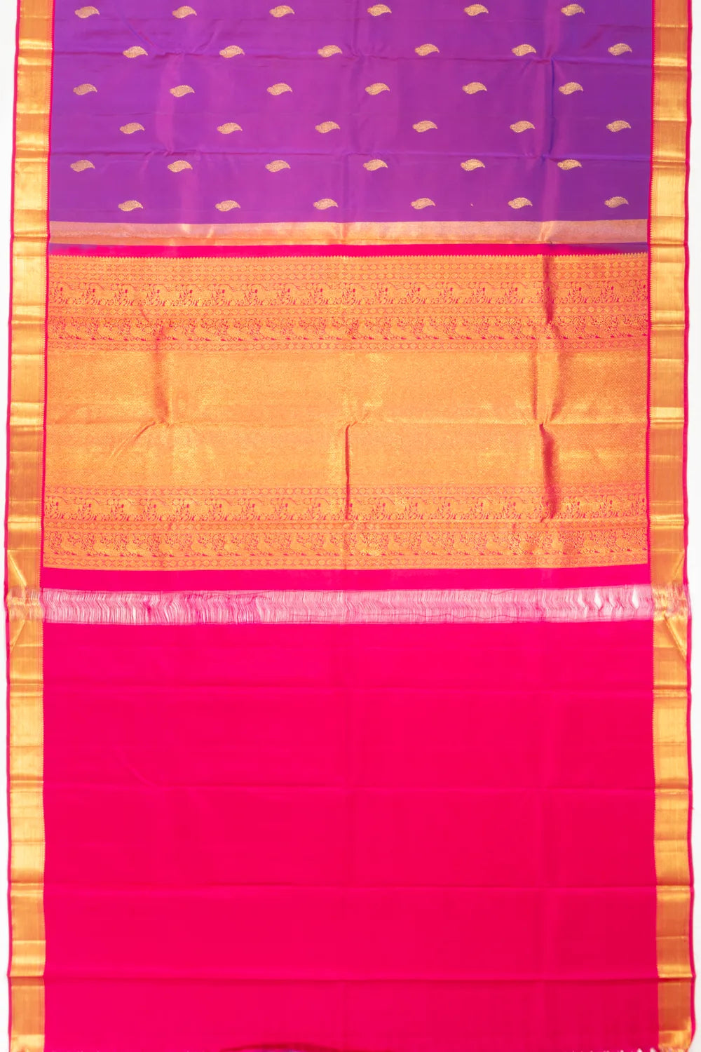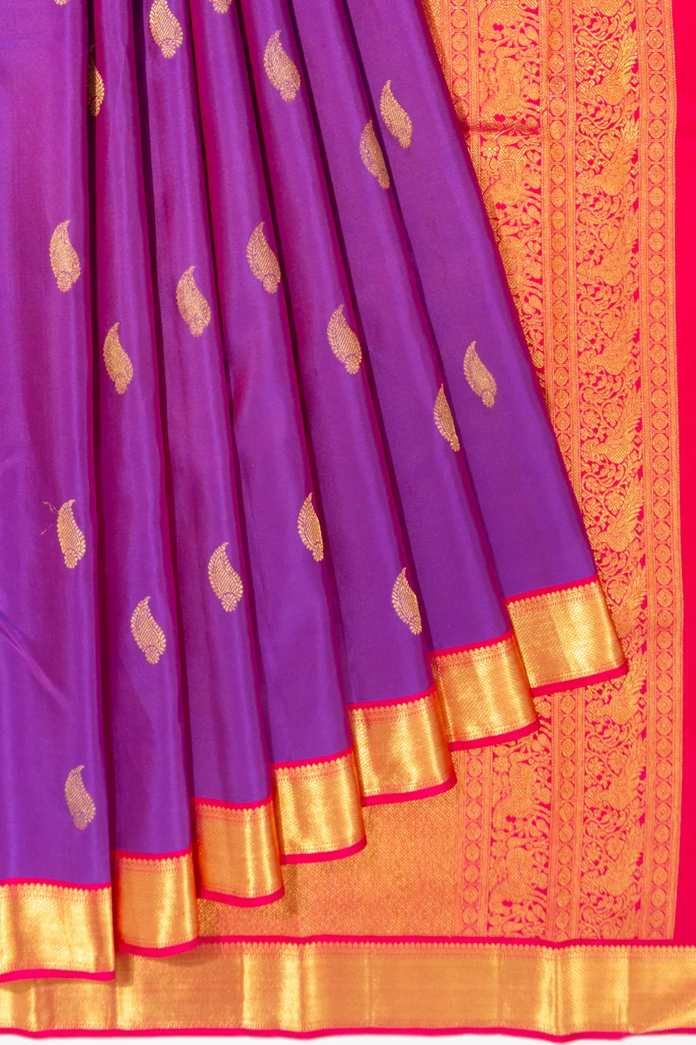The saree boasts a rich purple base adorned with delicate gold zari floral butta motifs, creating a luxurious and elegant texture.