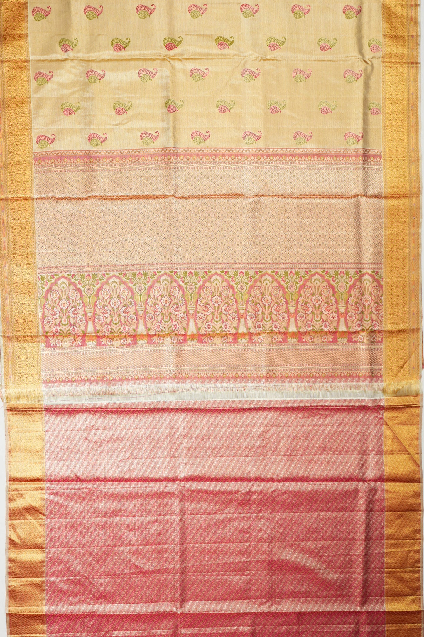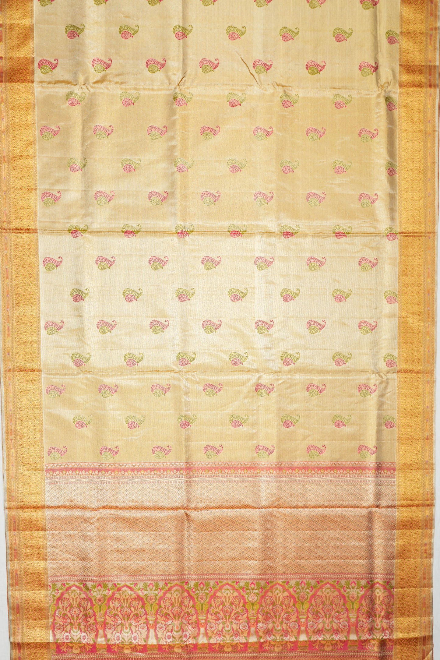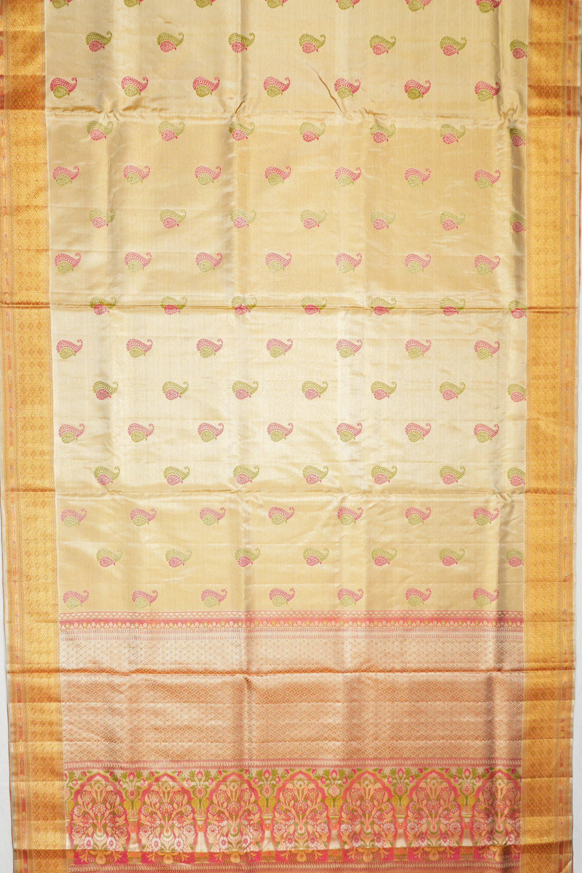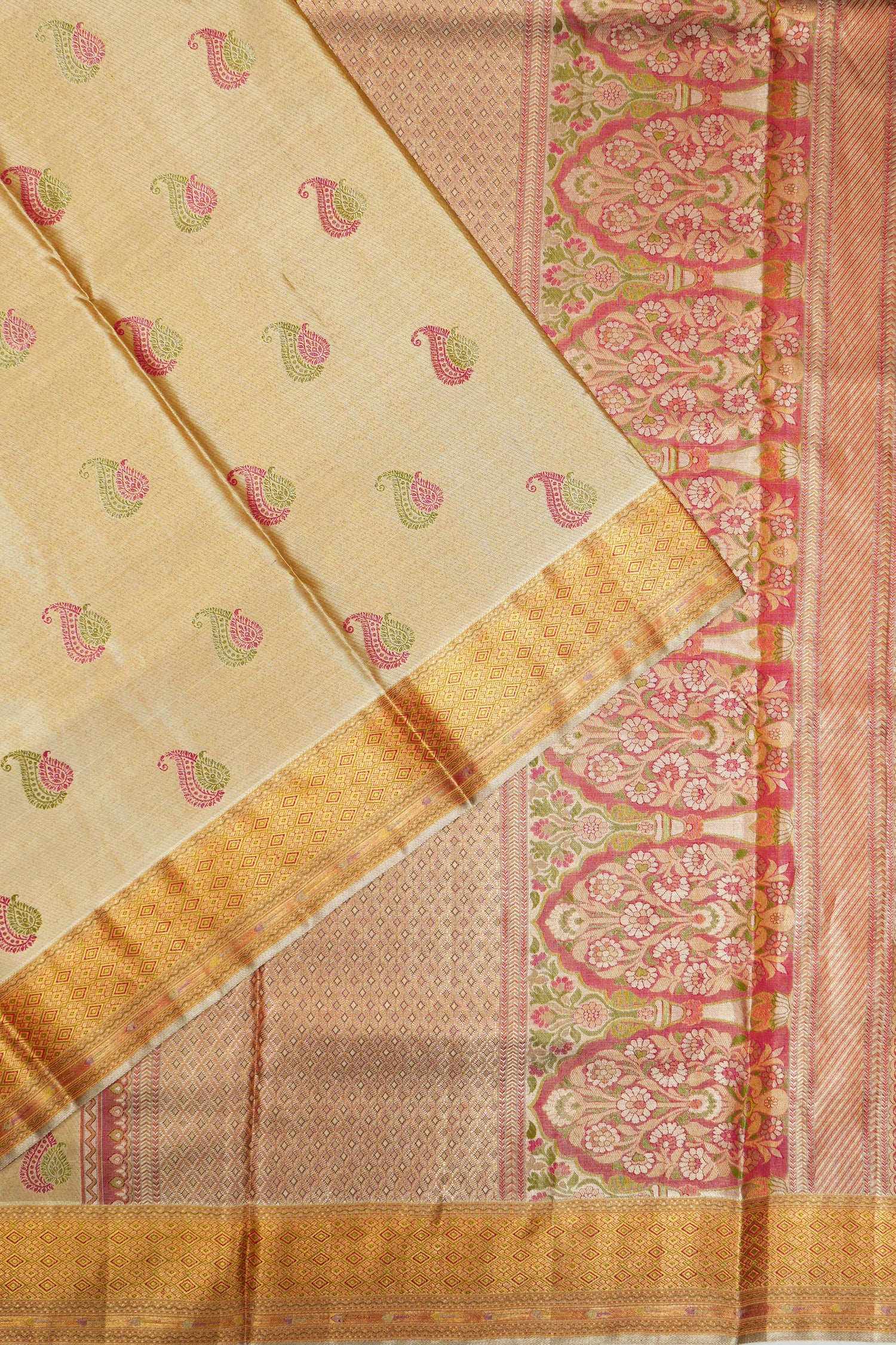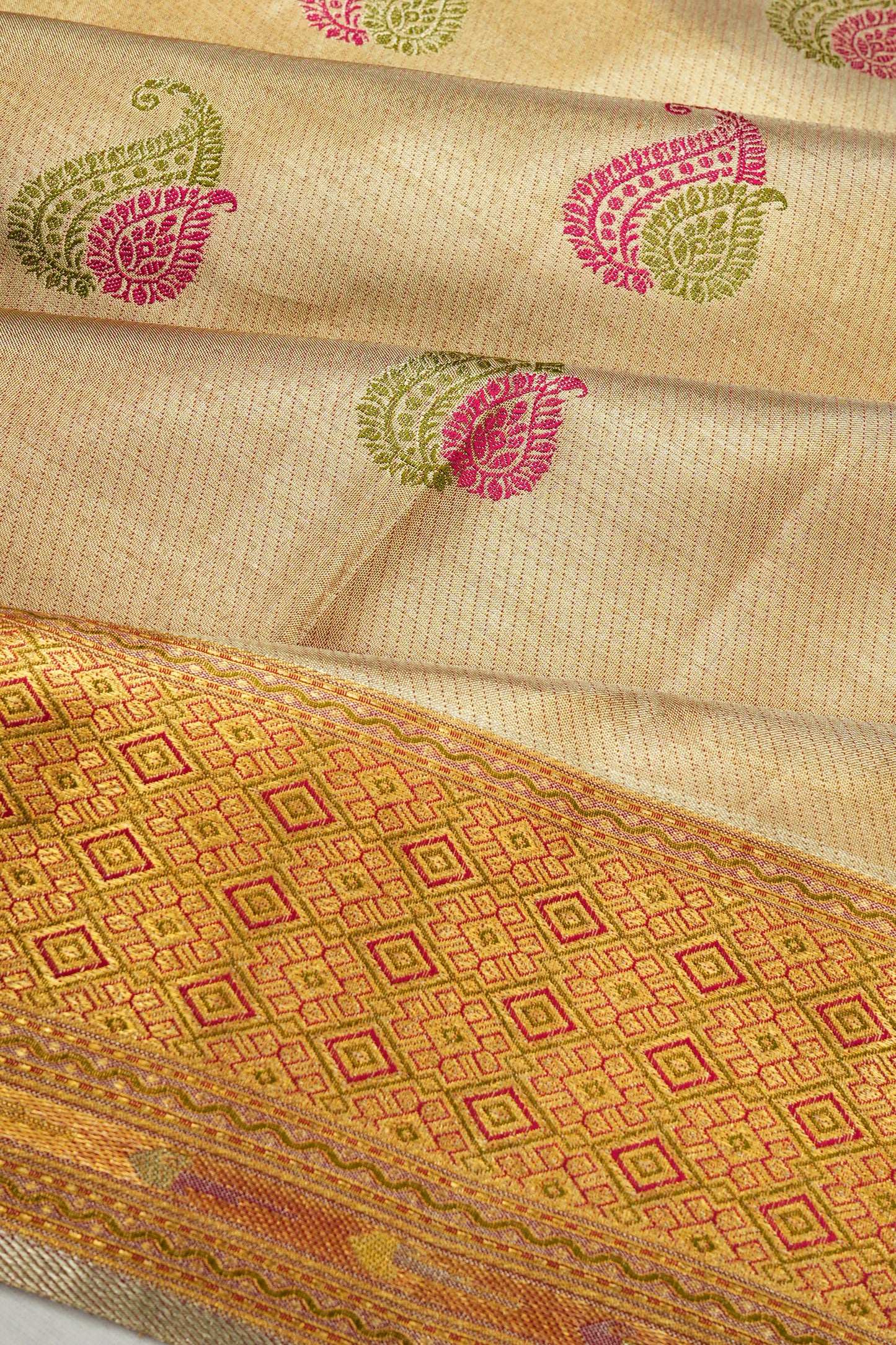 Green and pink meenakari paisley butta motifs woven delicately on a gold zari tissue base, creating a vibrant yet traditional look.