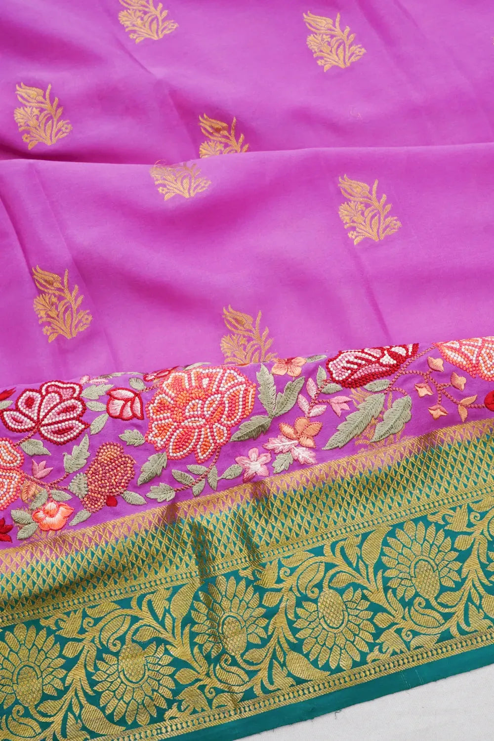 Complete your look with the coordinated plain teal green blouse, embellished with floral embroidery, bringing a cohesive and sophisticated charm to this stunning saree