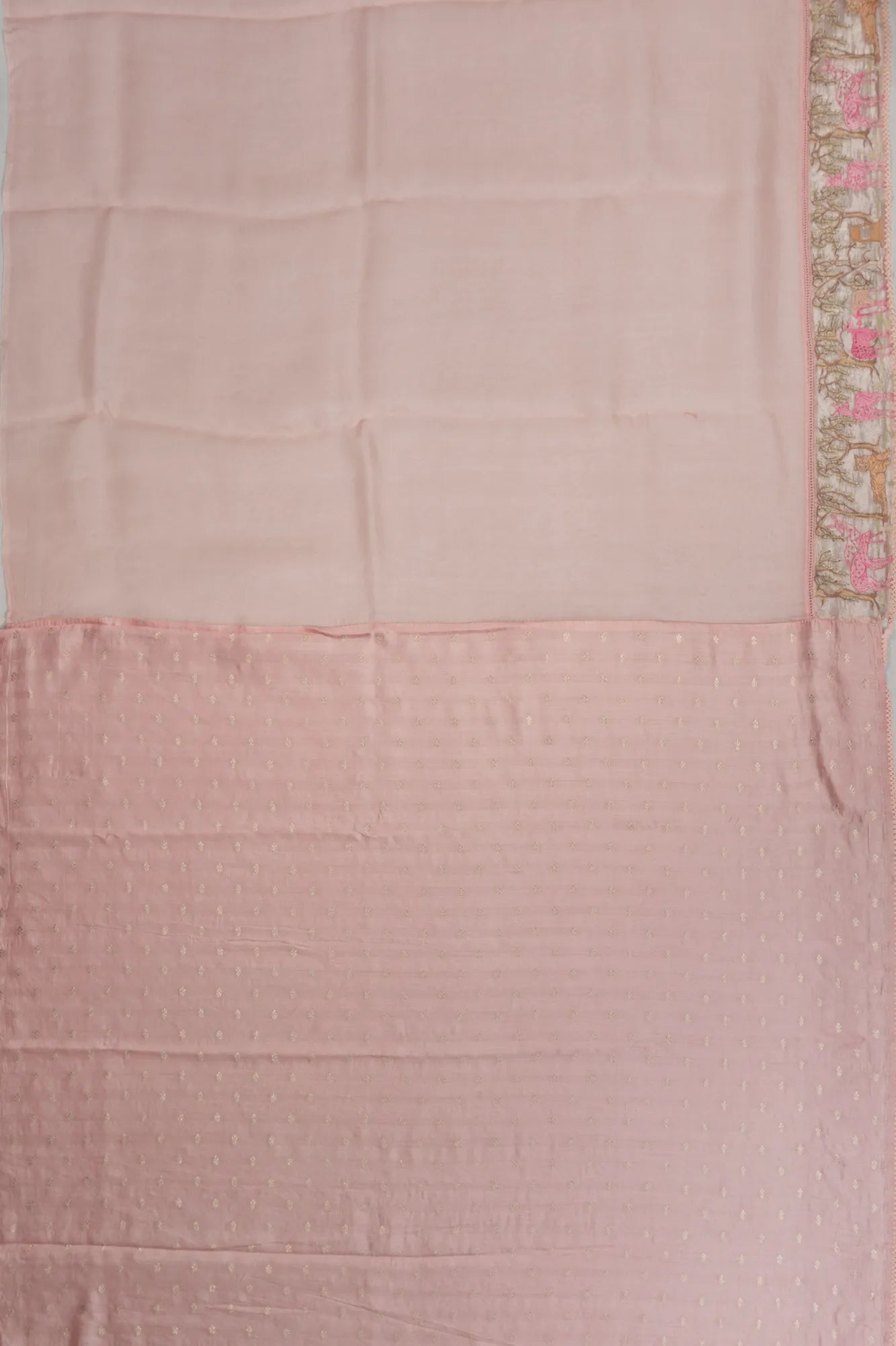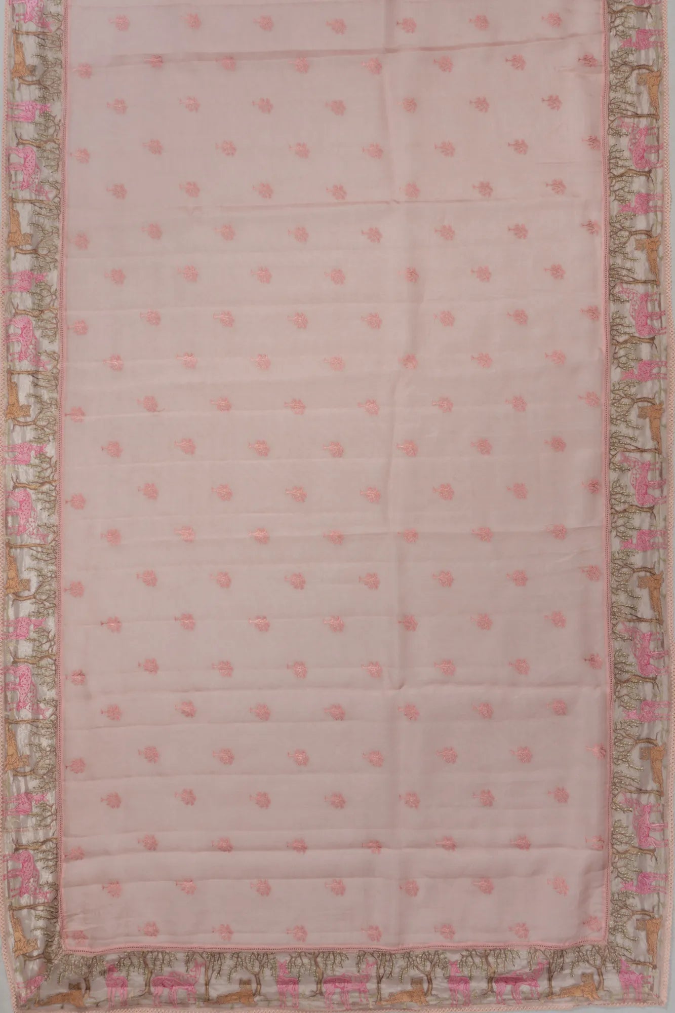 Its border is a work of art, showcasing self zari tissue adorned with intricate floral embroidery, complemented by enchanting deer and tiger motifs