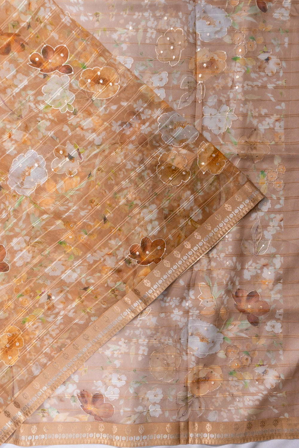 Organza Floral Printed Brown Saree With Embroidery Outline