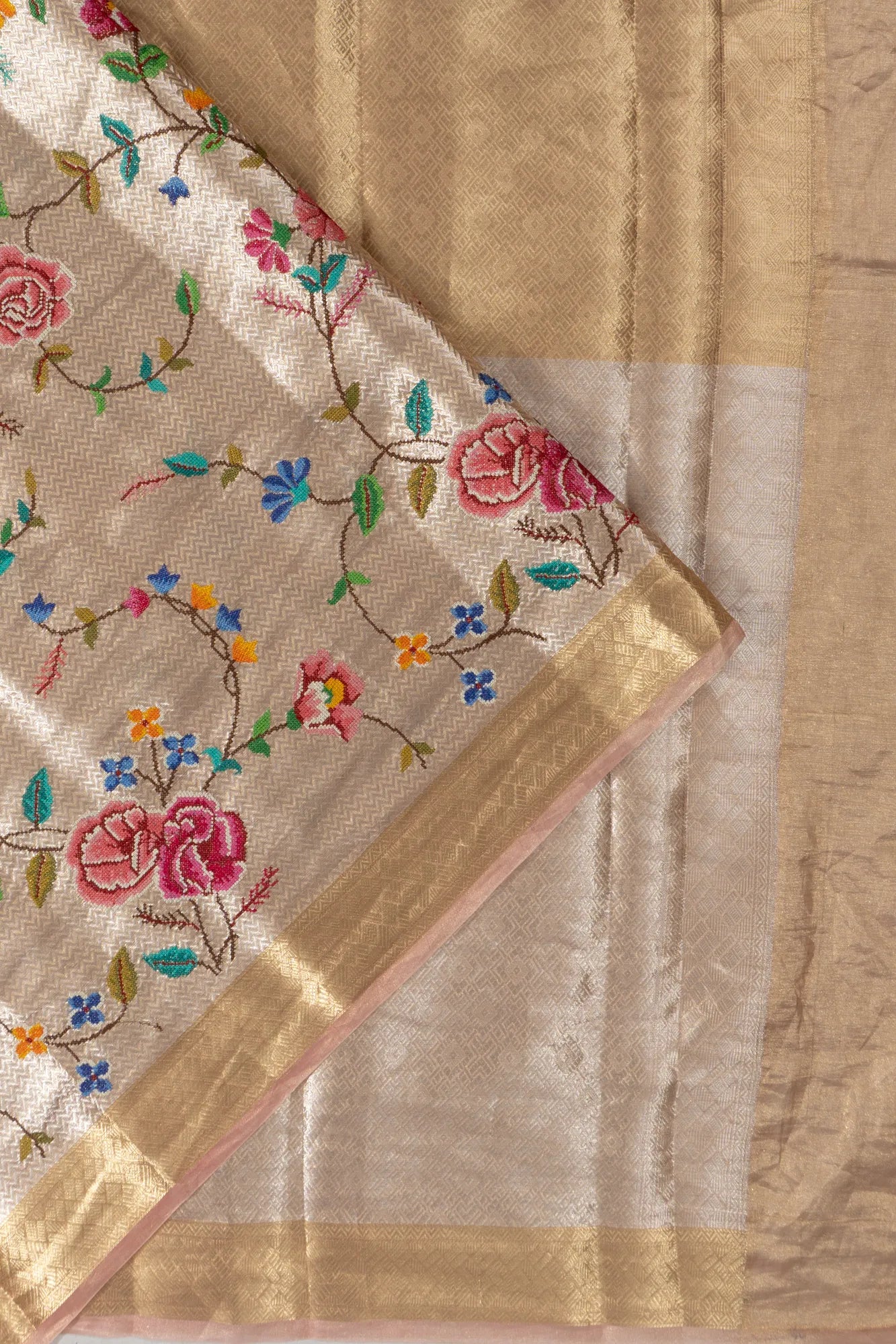 The saree's body is adorned with a gold zari brocade, beautifully interwoven with zigzag lines and an embroidery floral jaal, creating a stunning visual symphony of textures and hues