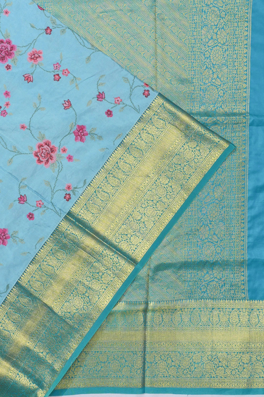 The saree's border presents a striking contrast with its gold zari brocade in a medium blue hue, adding a regal touch to the ensemble