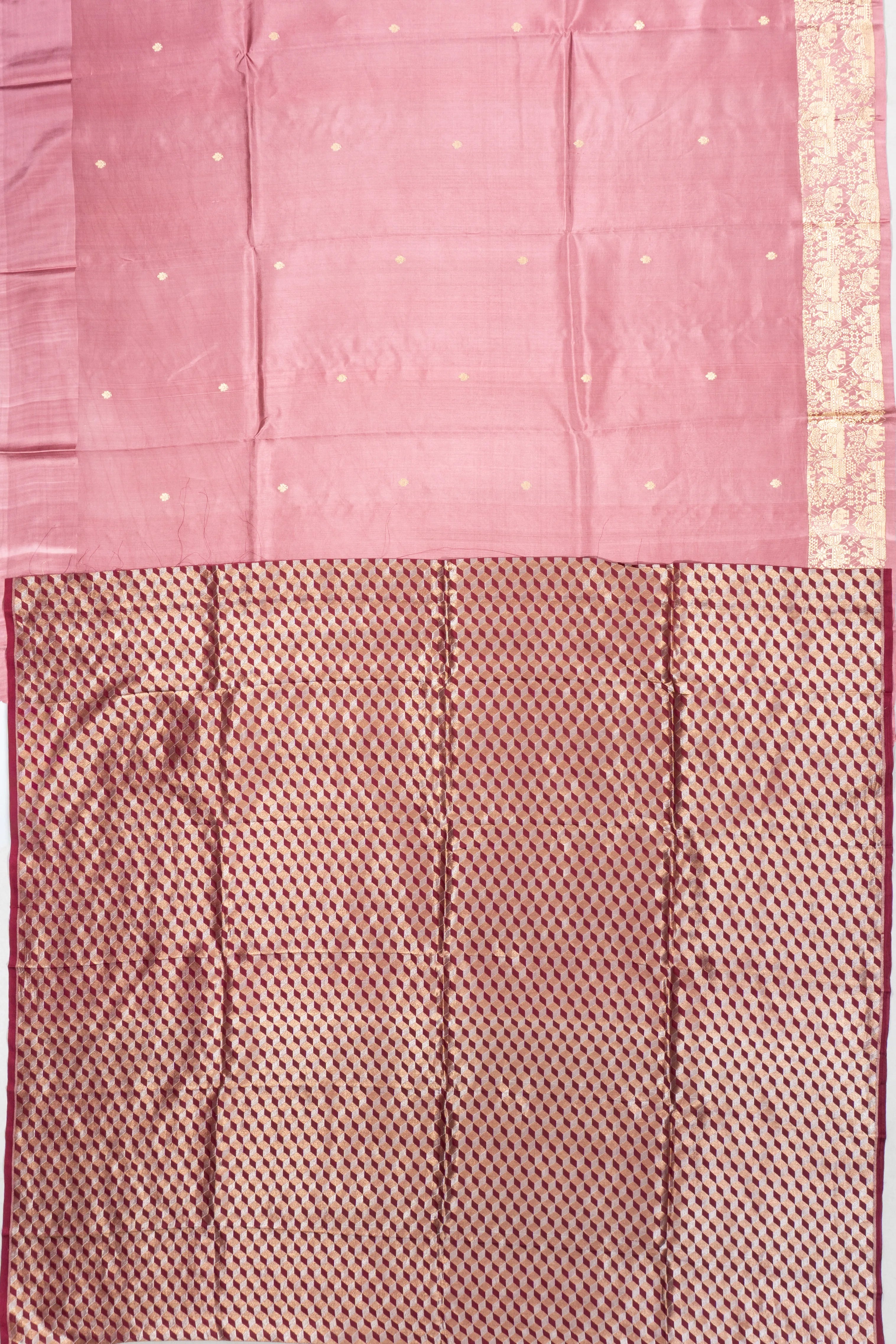 The saree's body is adorned with delicate gold zari floral buttas, exuding a sense of grace and luxury with every fold
