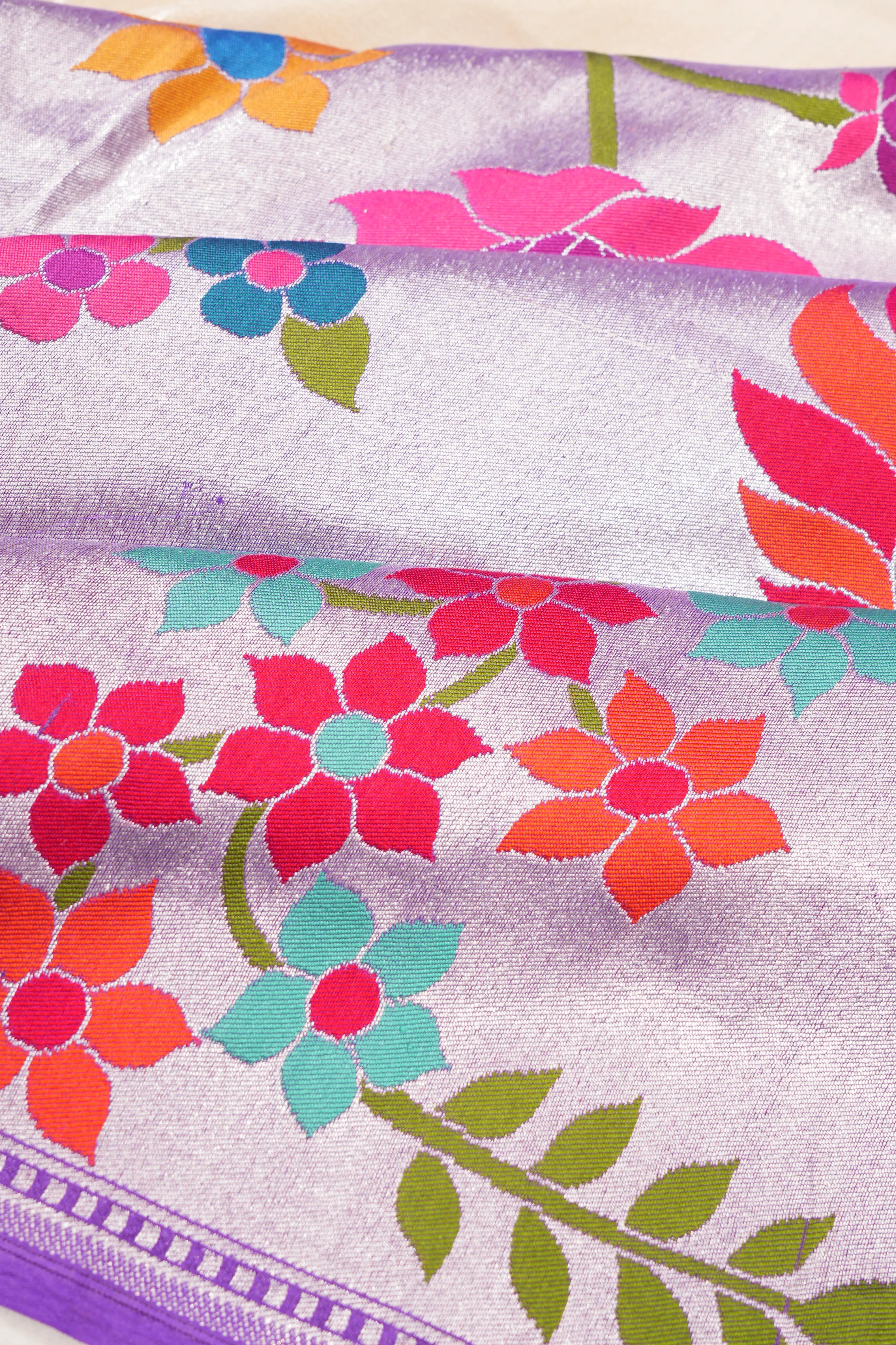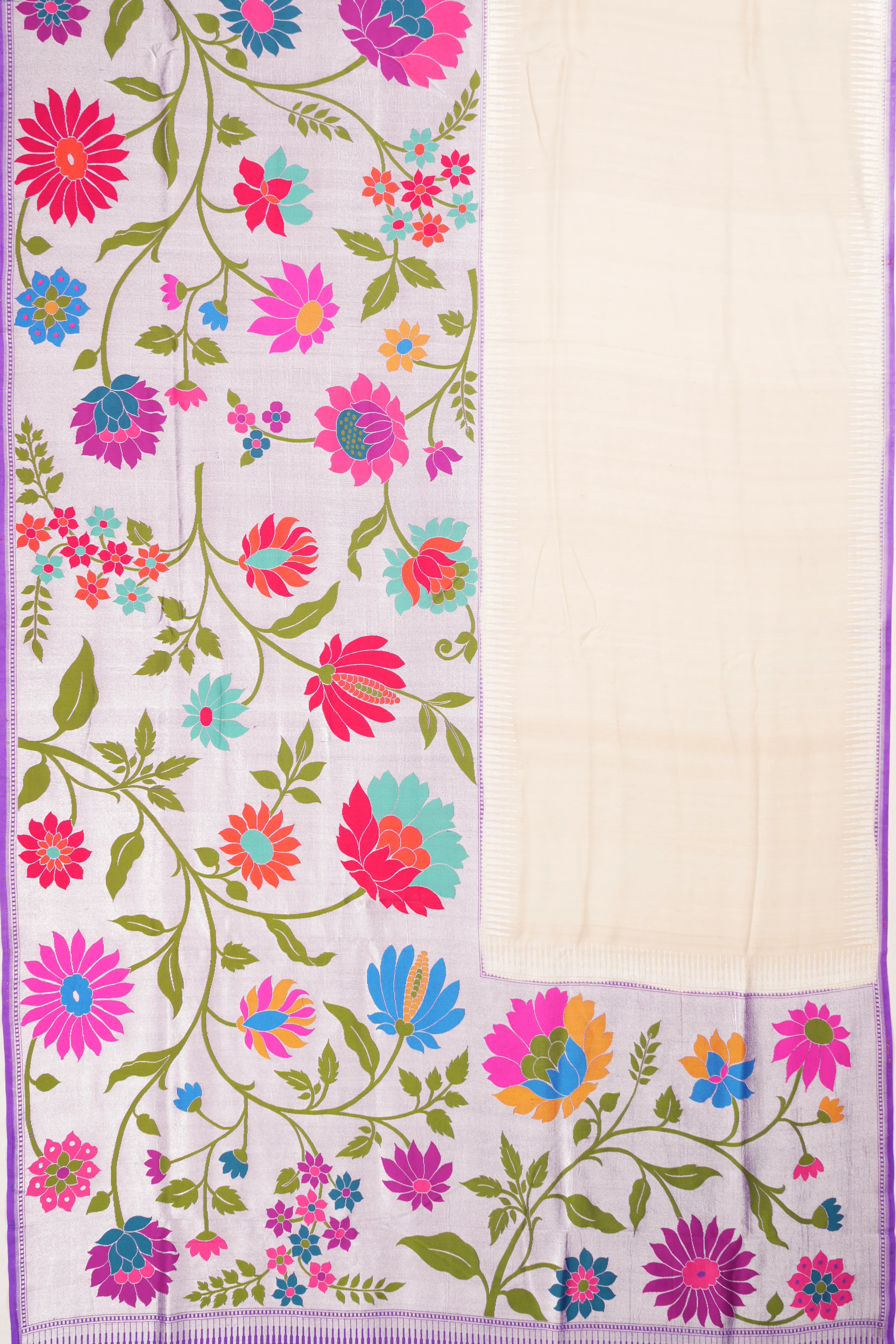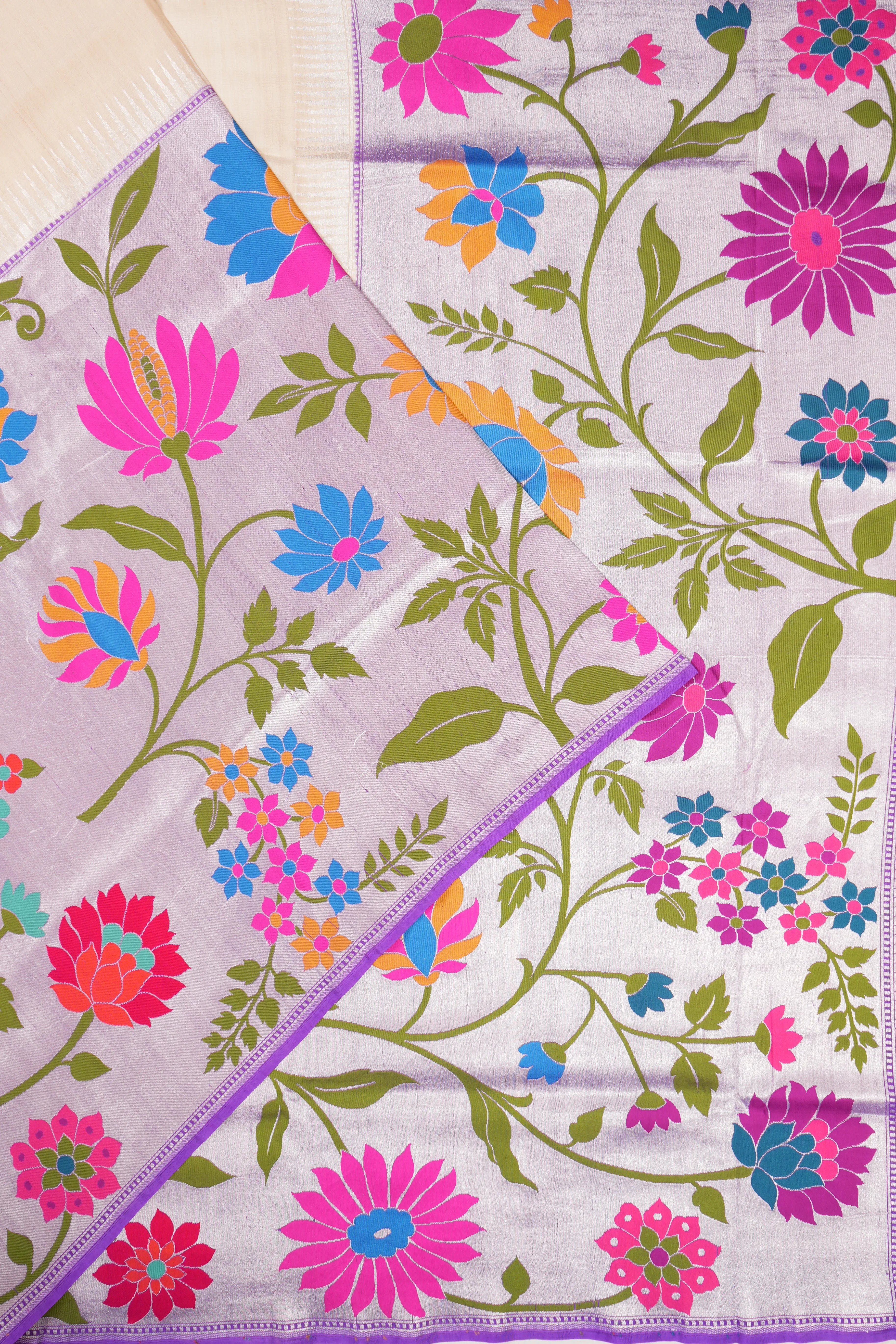 A striking contrast is provided by a very big violet border adorned with silver zari floral vines, making a bold and luxurious statement.