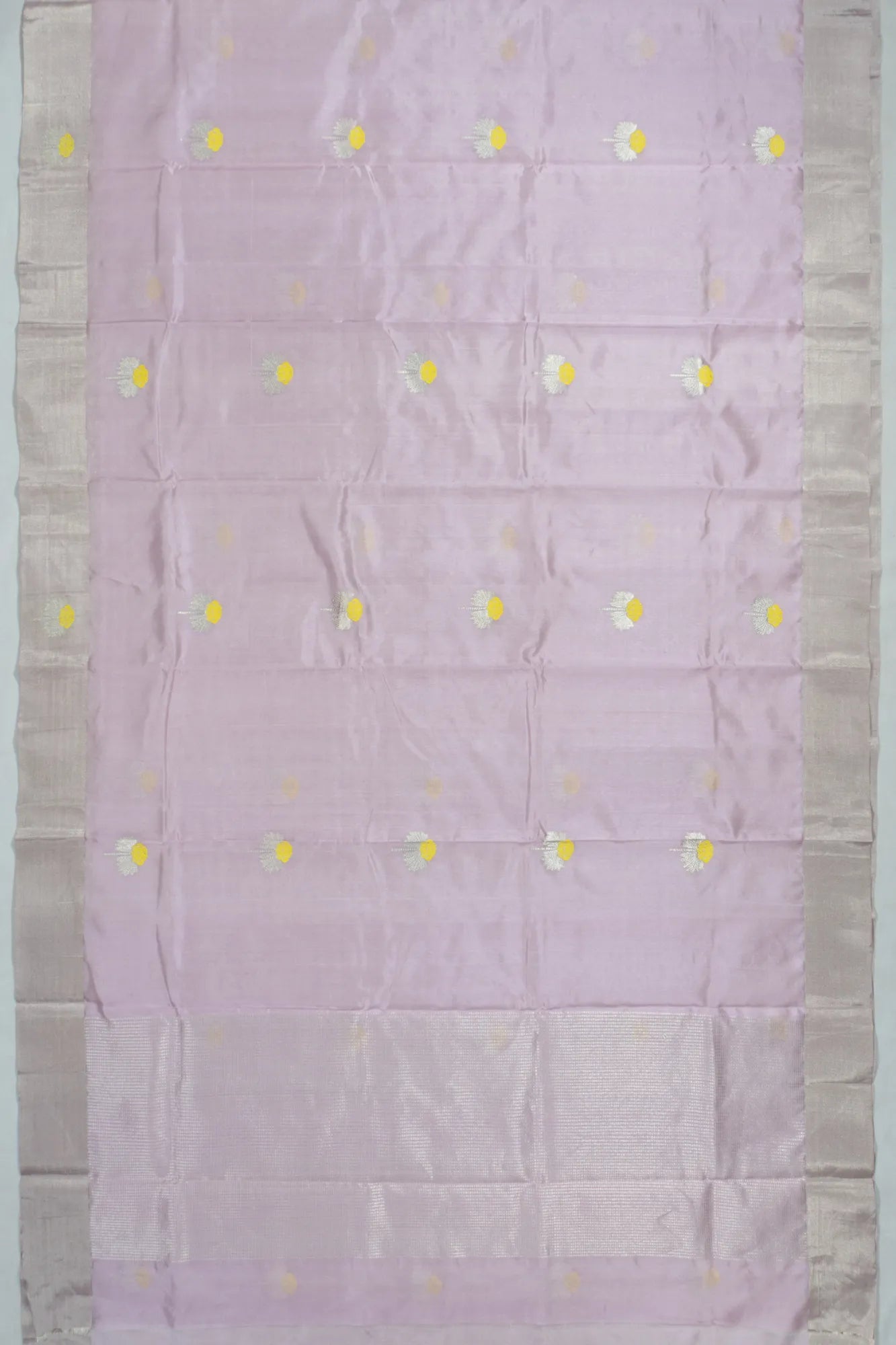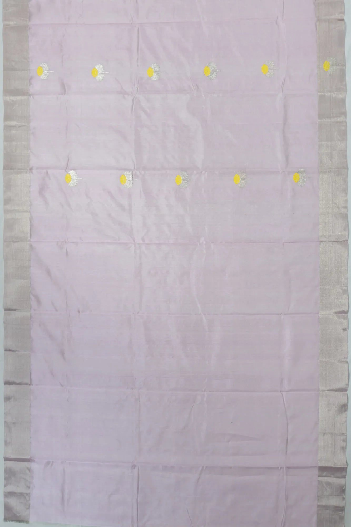 The body of the saree is adorned with silver zari floral buttas, highlighted with touches of yellow, creating a graceful interplay of color and shimmer
