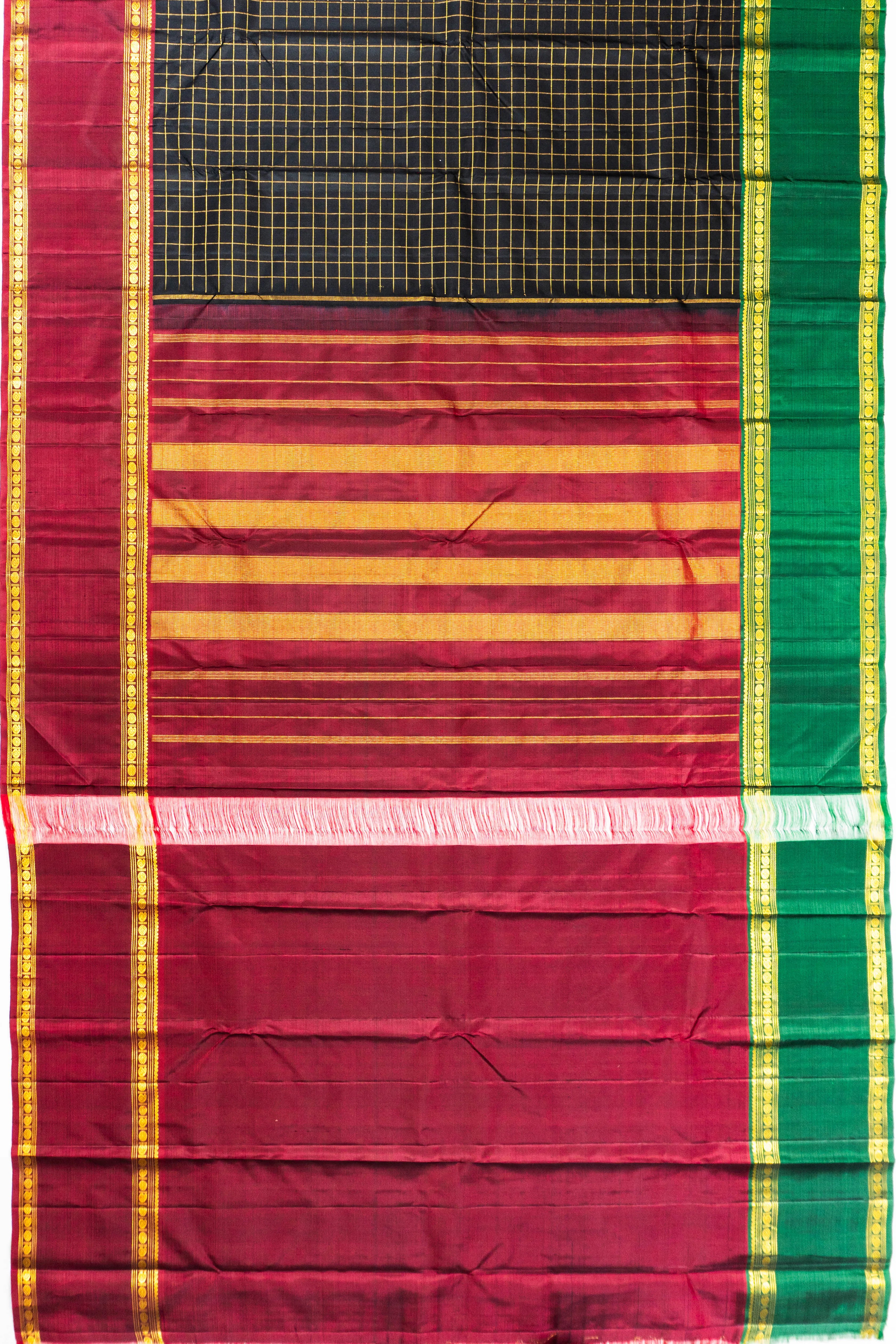 Classic Kanchipuram Silk Checks Black Saree With Rettai Pettu Ganga Jamuna Border