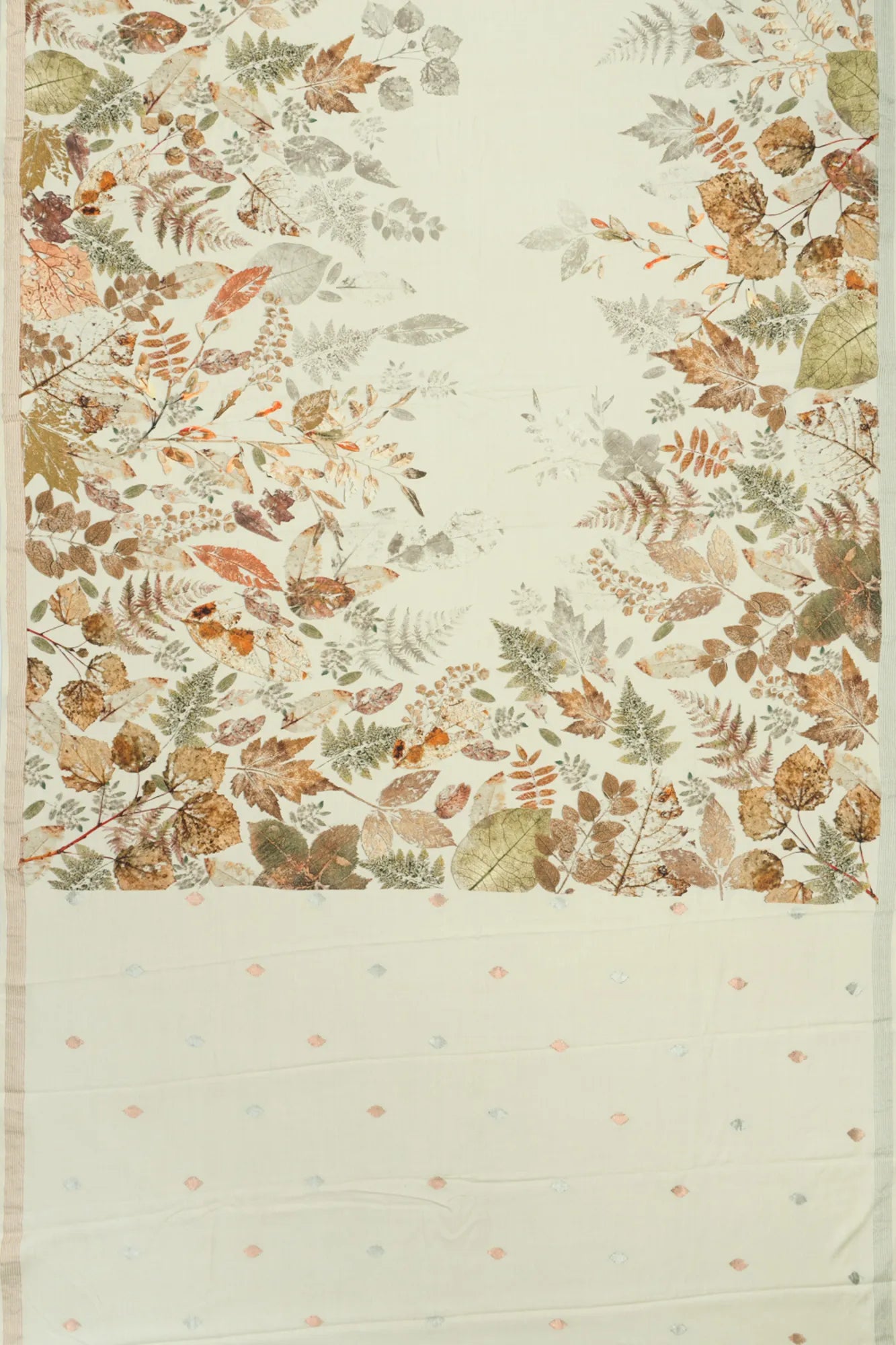 The saree's body is adorned with delicate floral prints, offering a subtle yet captivating charm that speaks to the heart of Indian craftsmanship