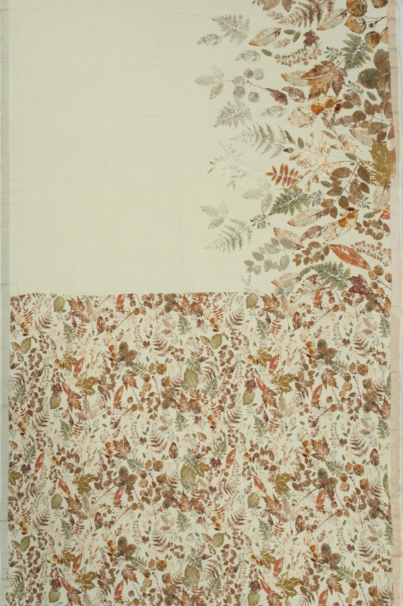 The saree features a self gold zari border with horizontal lines, perfectly accentuating the cream backdrop with its understated opulence