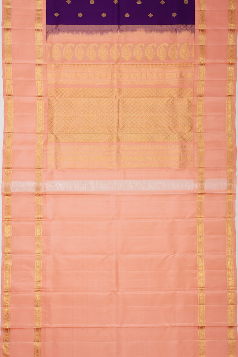 A striking contrast is offered by the medium pink border, woven in resplendent gold zari, adding a touch of opulence and grandeur to the ensemble