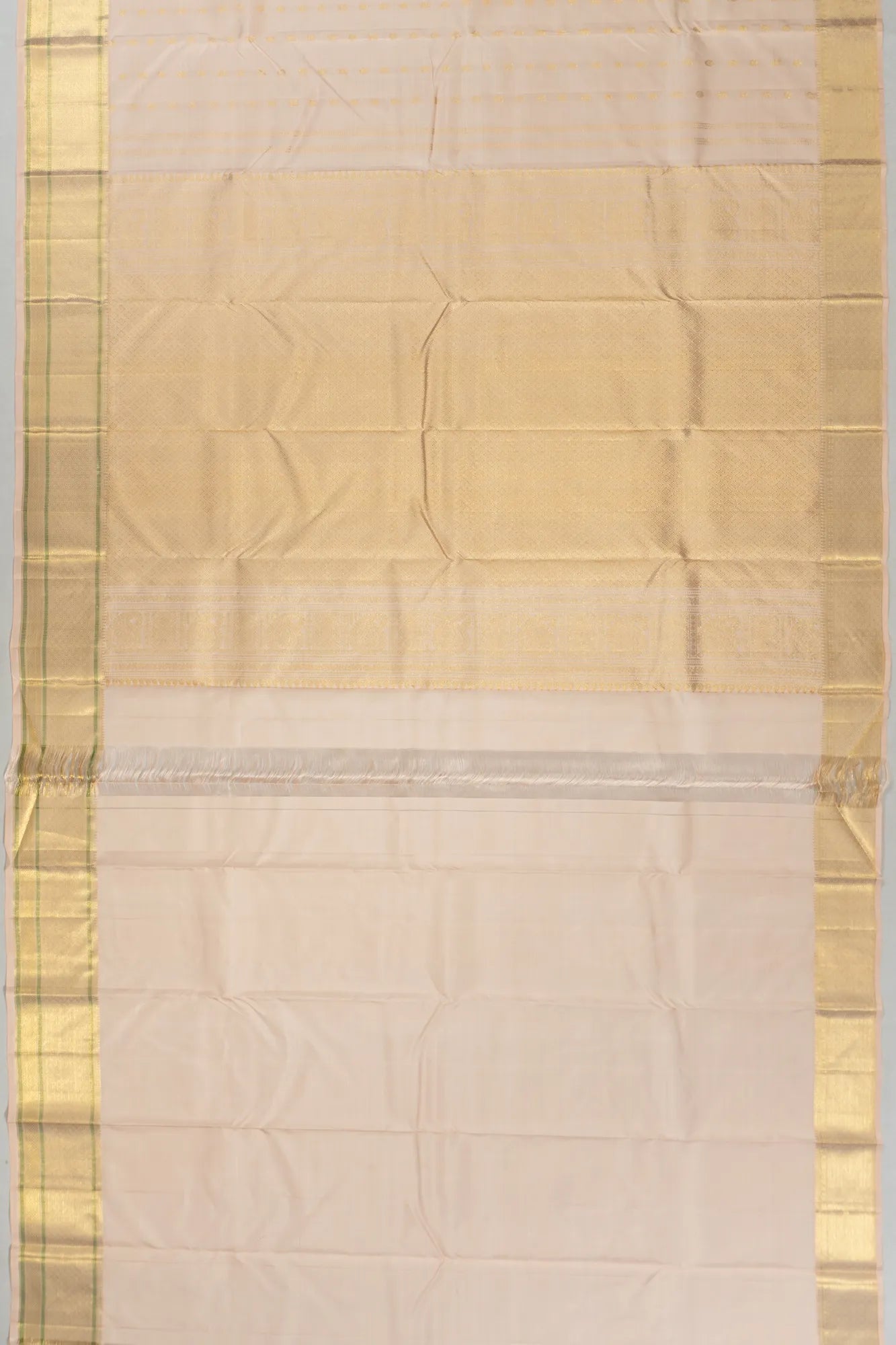 The luxurious cream silk is adorned with gold zari peacock and floral motifs, creating a butta design that catches the eye with its graceful charm