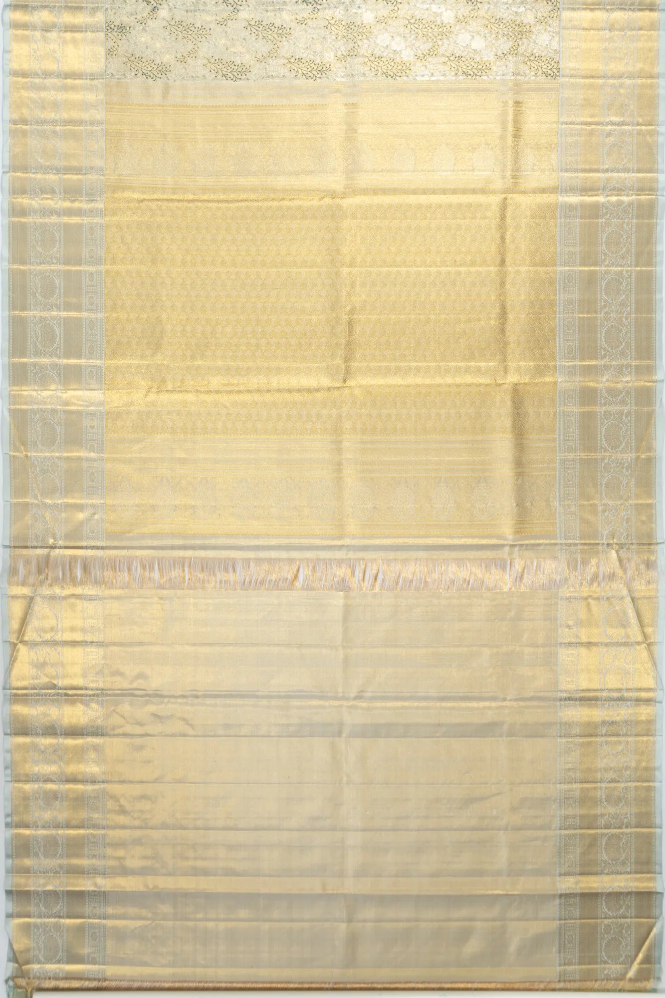 The gold body glows with gold zari tissue woven with silver zari floral brocade, giving a serene yet luxurious texture to the elegant drape.