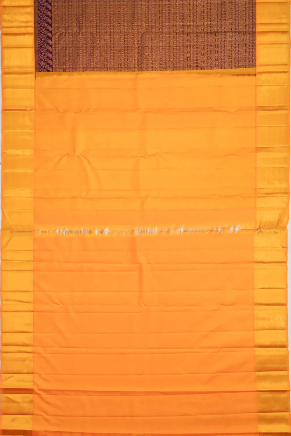 The saree is accentuated by a small yellow border with contrast gold zari diagonal lines, providing a sophisticated frame to the rich purple body