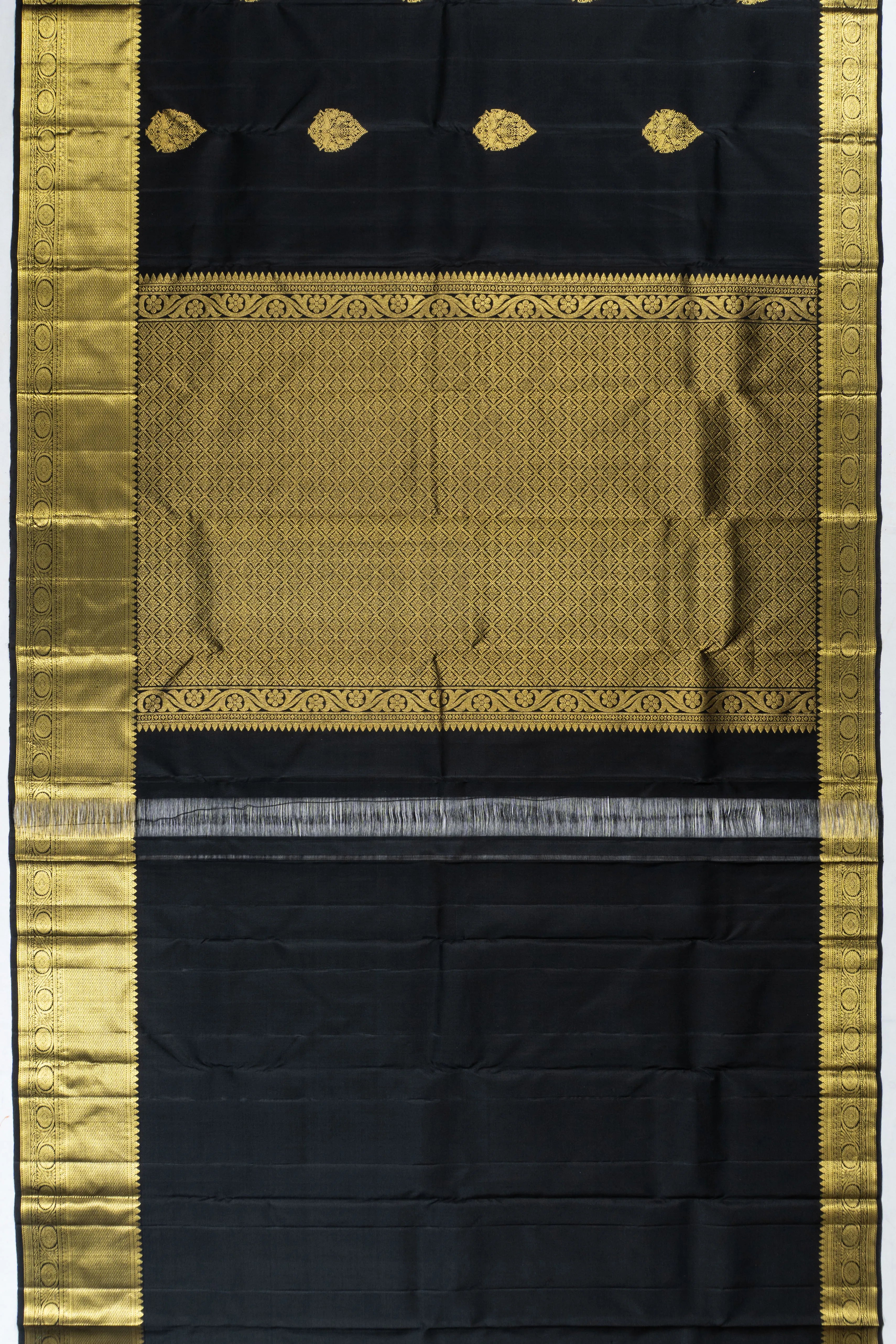 The luxurious black silk is adorned with intricate gold zari yali and peacock floral buttas, a tribute to heritage and grace