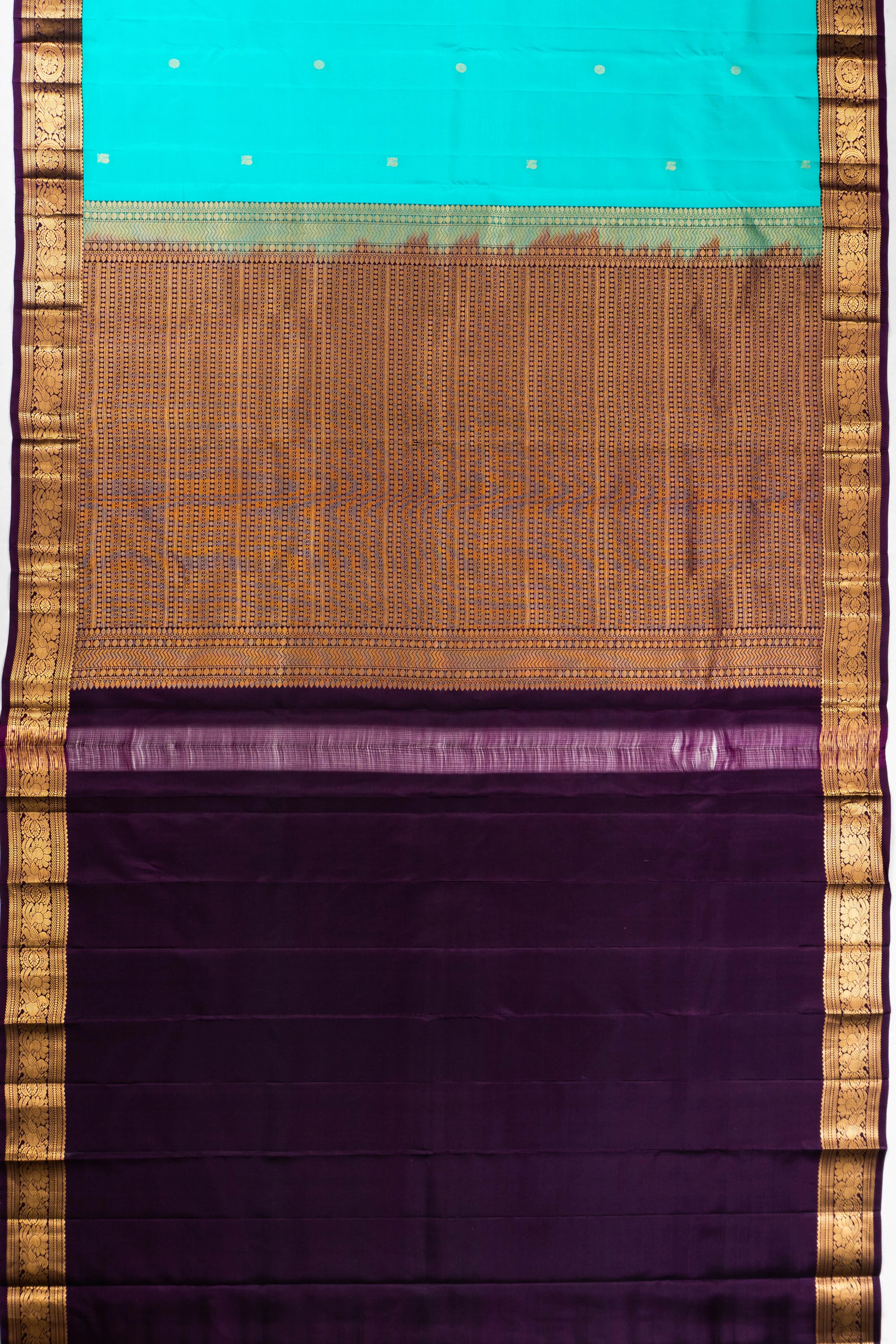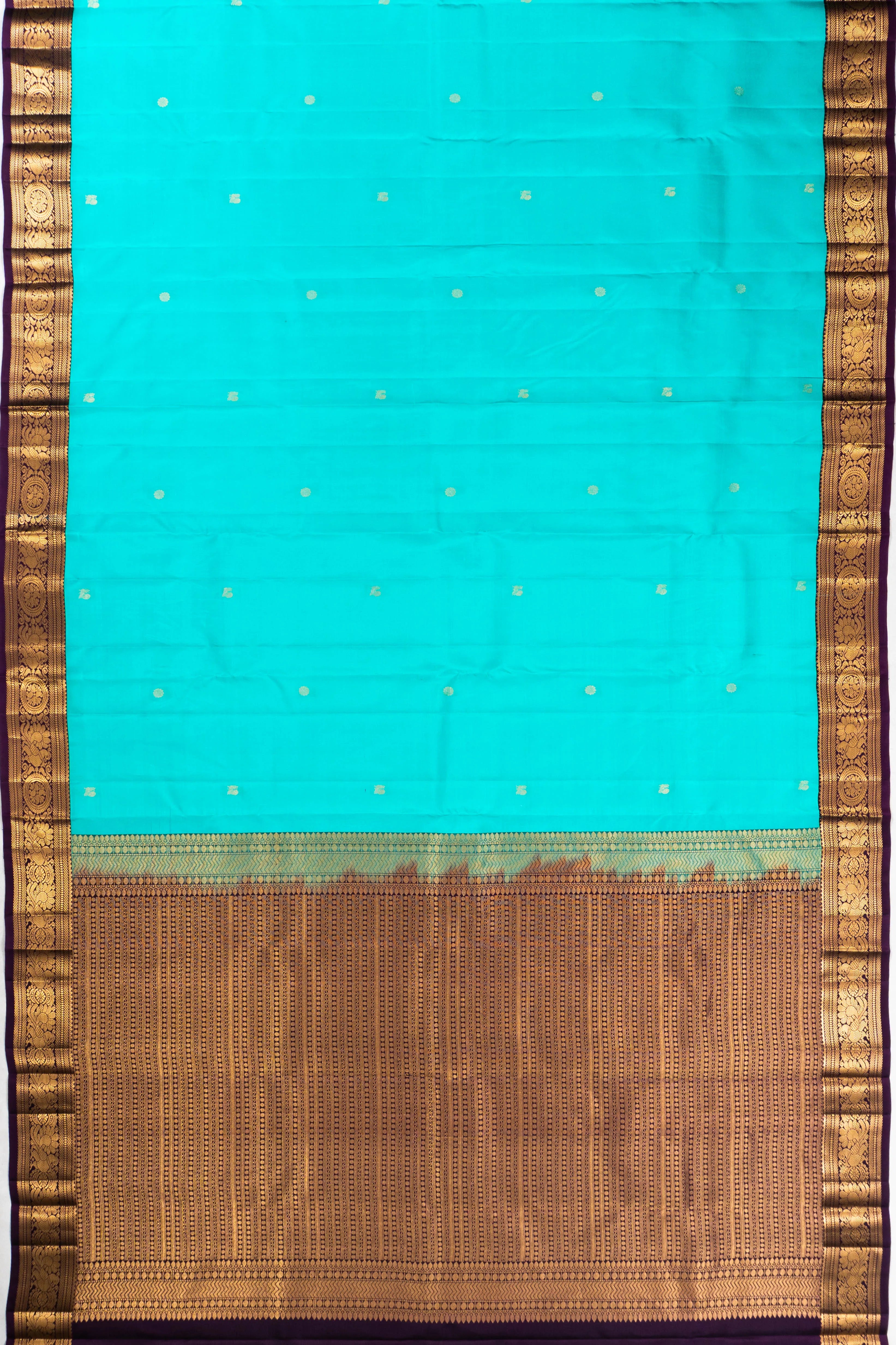 A small purple border, beautifully contrasted with gold zari floral brocade and intricate peacock motifs, elevates the saree's charm