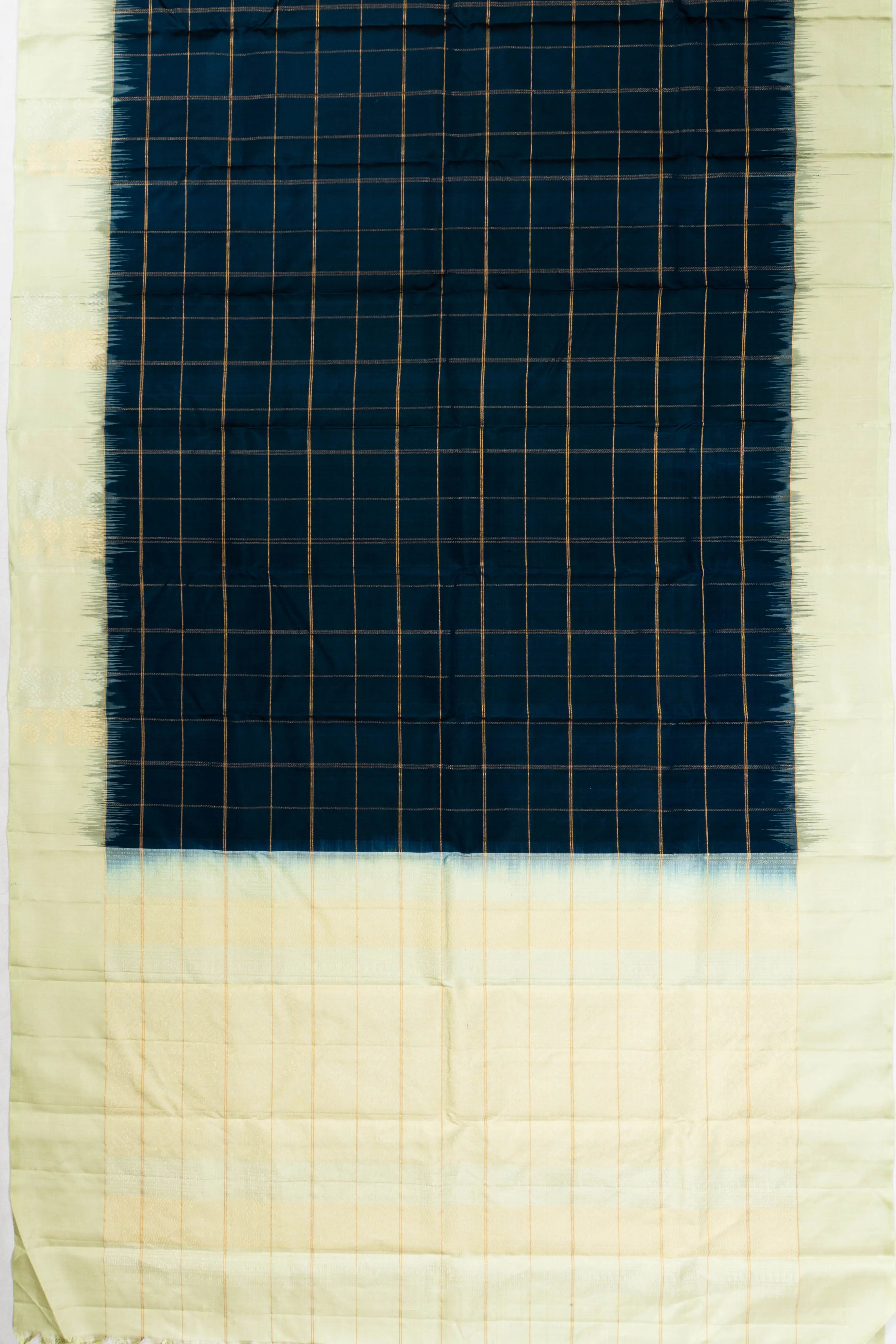 Accompanied by a cream blouse with gold zari checks, this saree presents a harmonious blend of tradition and style