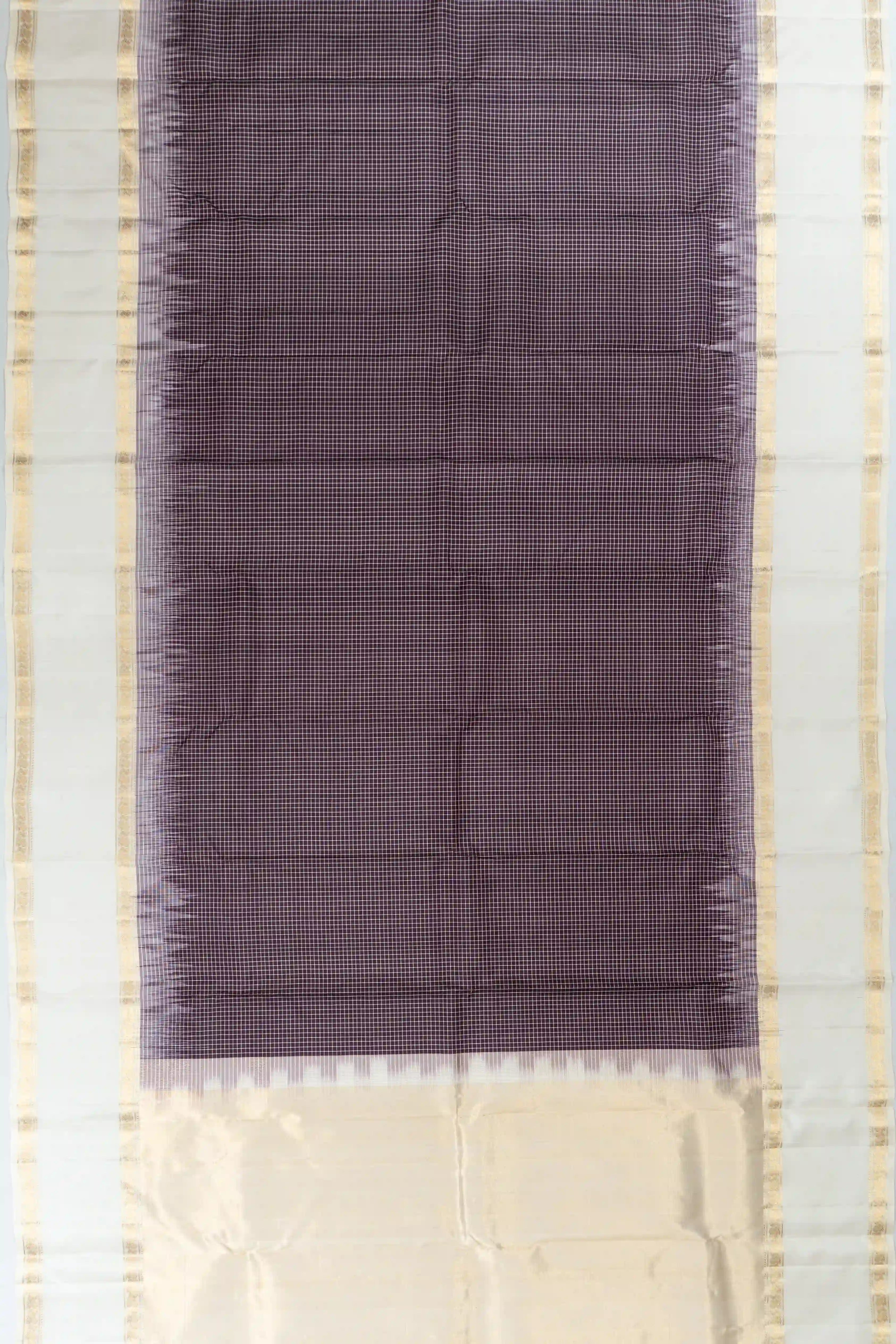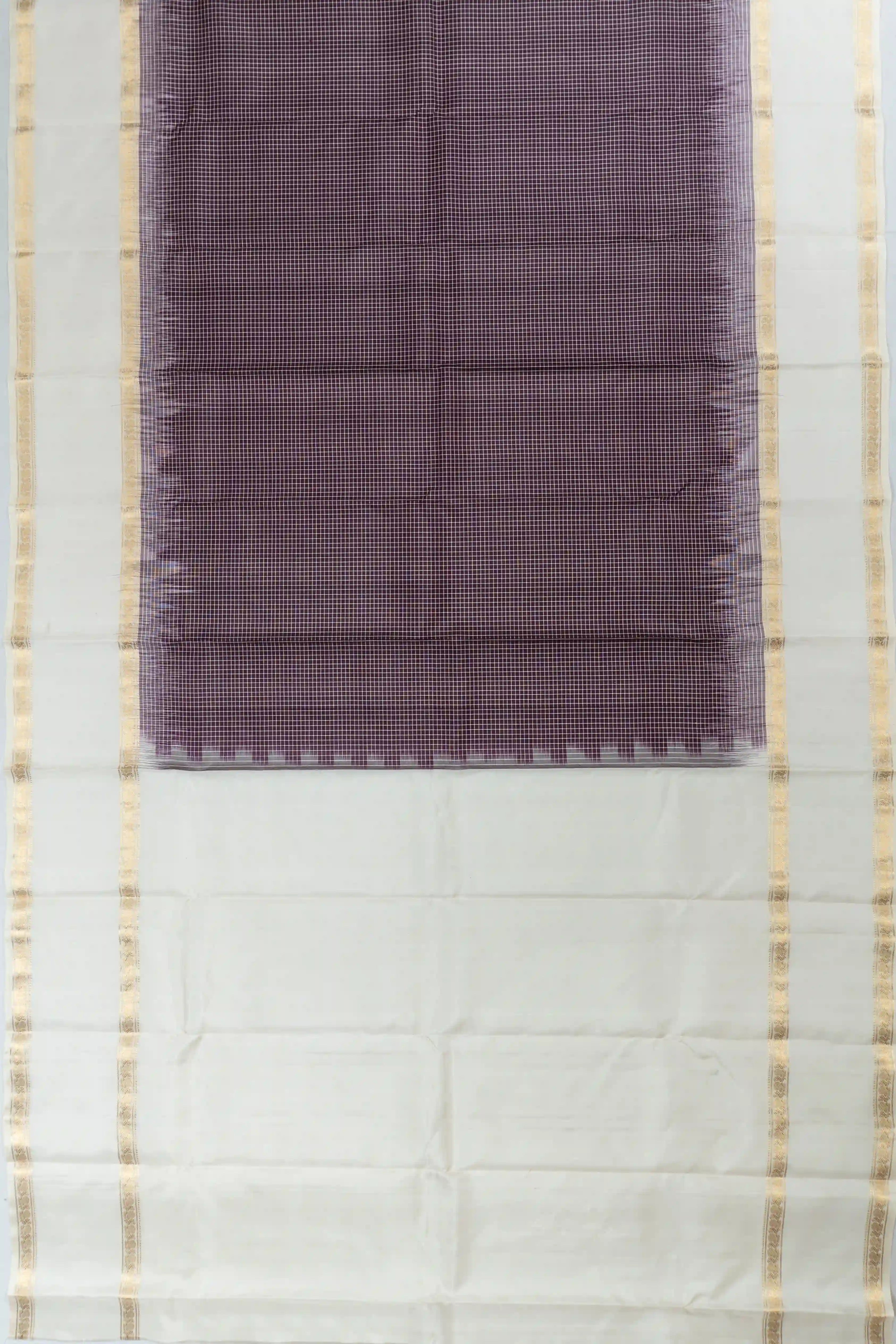 The saree's body features a captivating interplay of checks in rich purple, exuding sophistication and classic charm