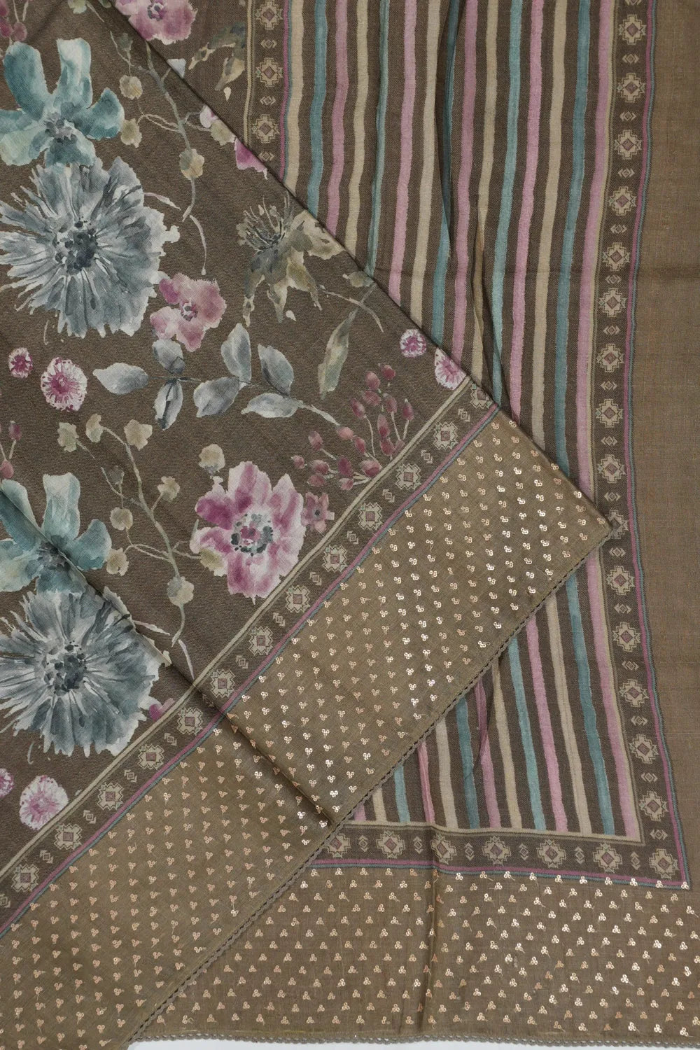 The saree's body is adorned with delicate prints that highlight the elegance and grace of traditional craftsmanship, making it a perfect blend of classic and contemporary styles