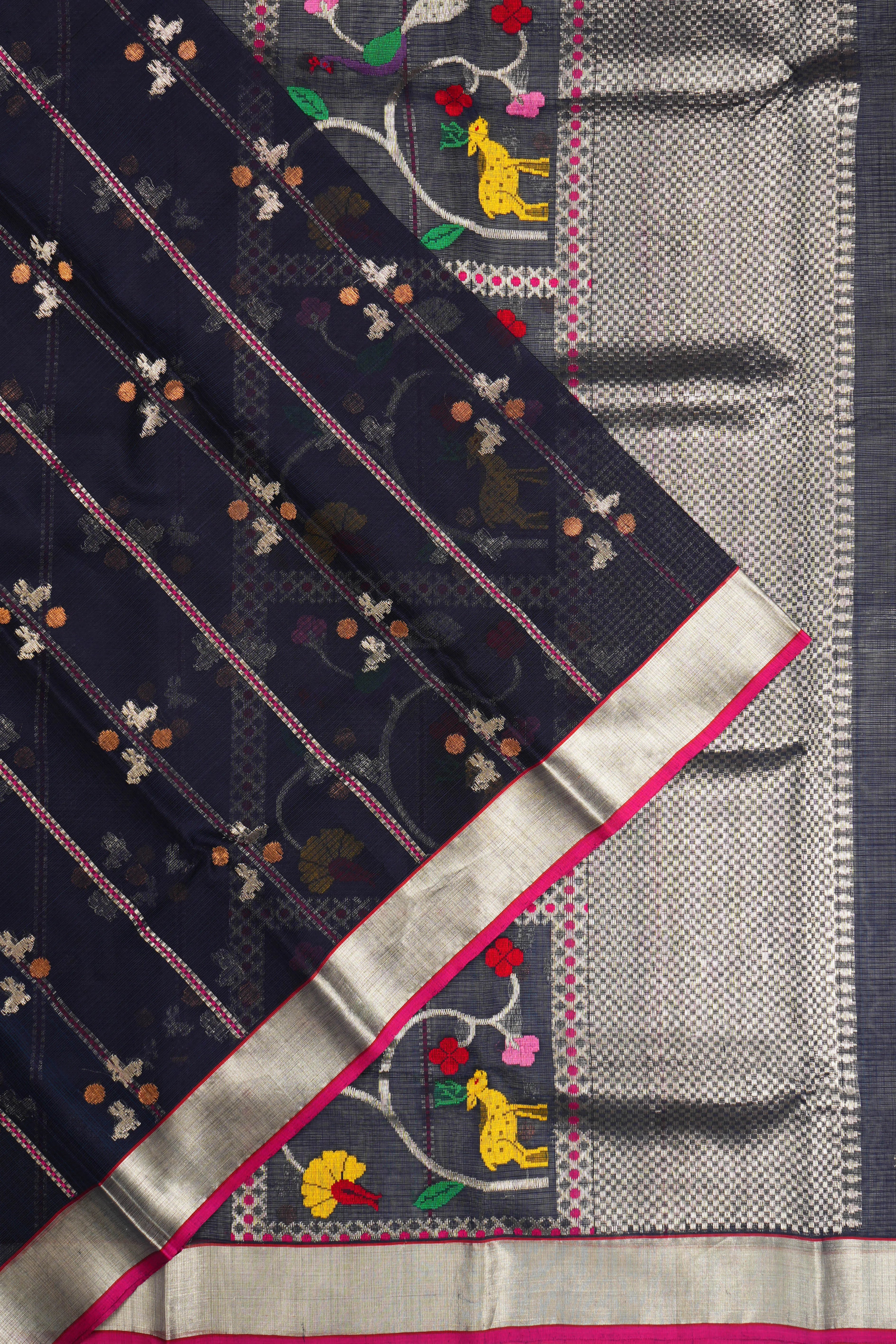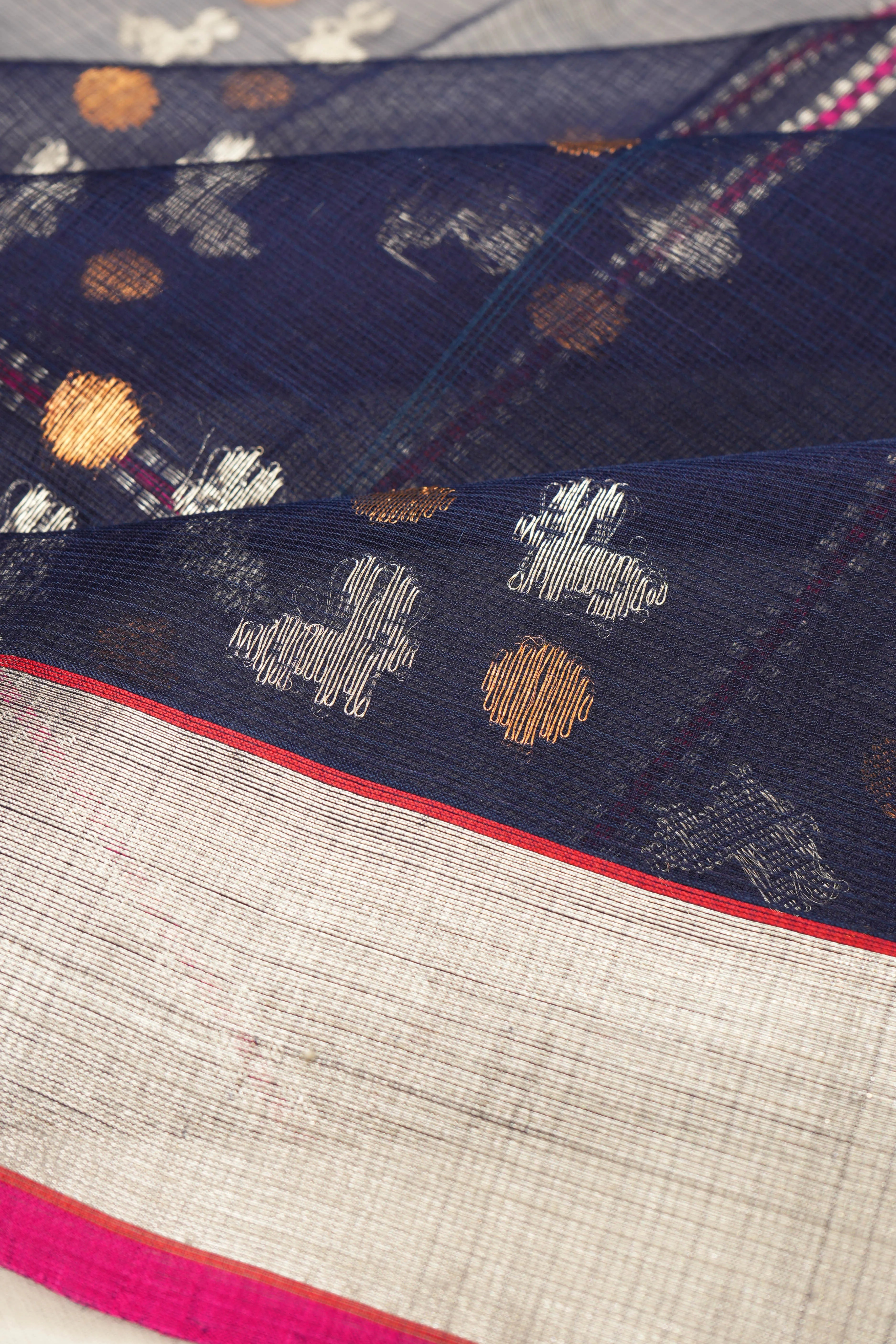 This dark blue saree features silver zari floral vertical lines along with gold zari polka dot buttas, giving it a balanced, contemporary touch while maintaining a traditional vibe.