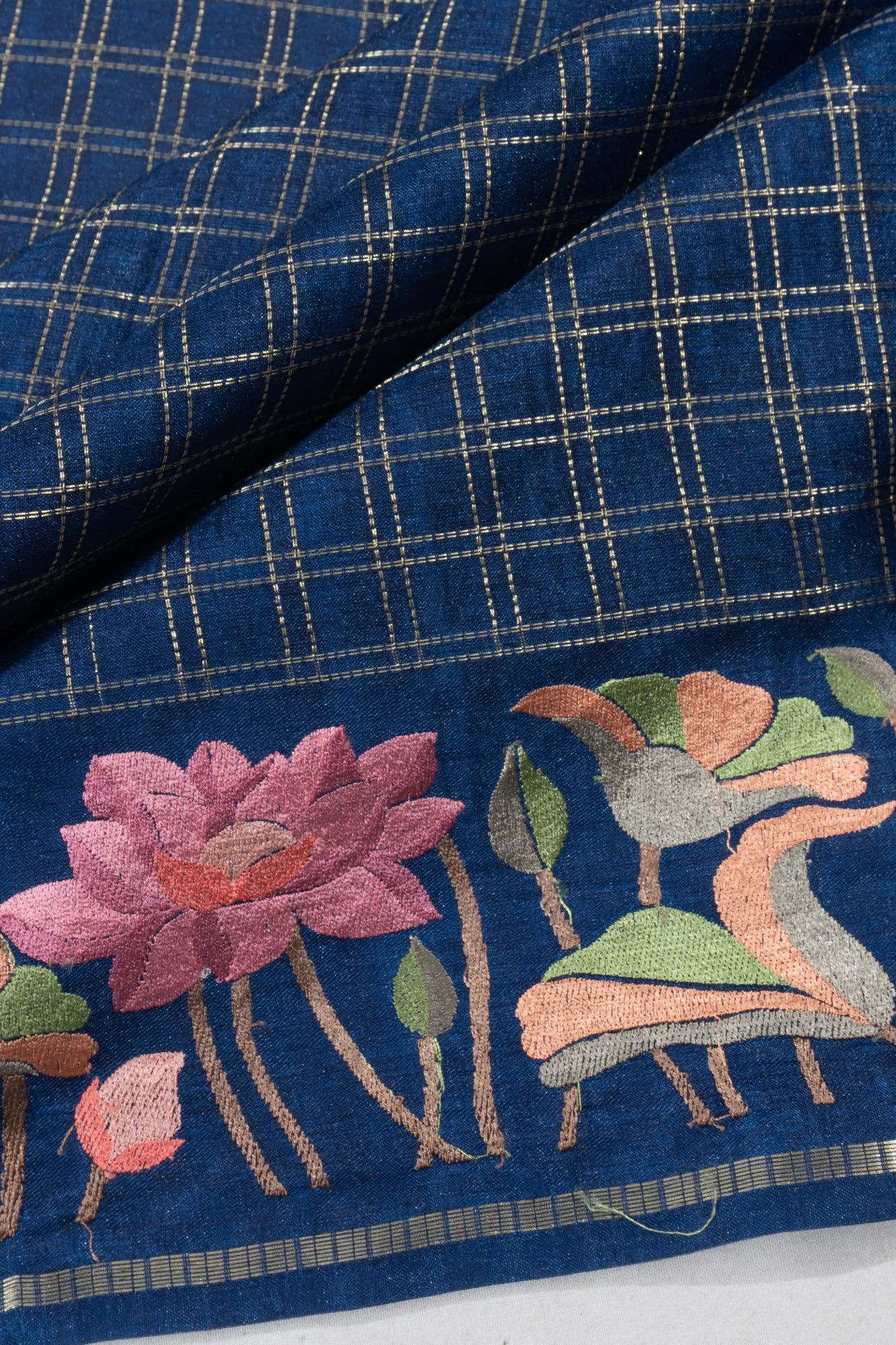 The body features delicate checks that add a touch of sophistication, while the self-embroidered floral brocade border, adorned with enchanting bird motifs, elevates the saree to a new level of grace