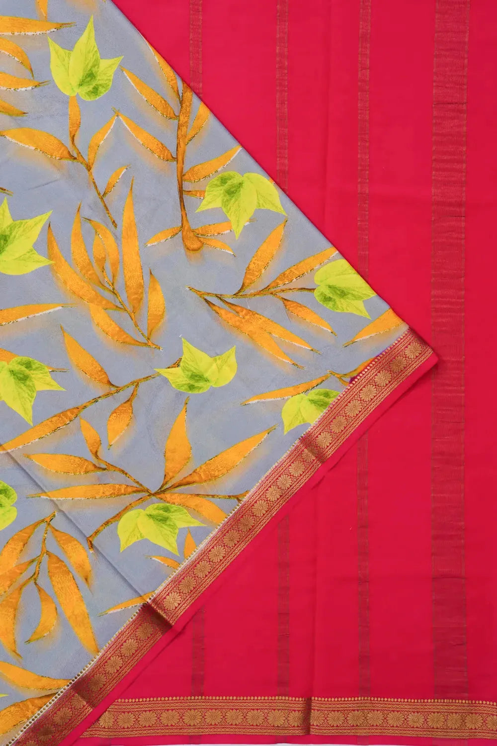 Embrace the allure of tradition with the Mysore Silk Floral Printed Grey Saree, an exquisite blend of heritage and elegance The saree's body is adorned with delicate floral prints, creating a graceful tapestry against the luxurious silk fabric