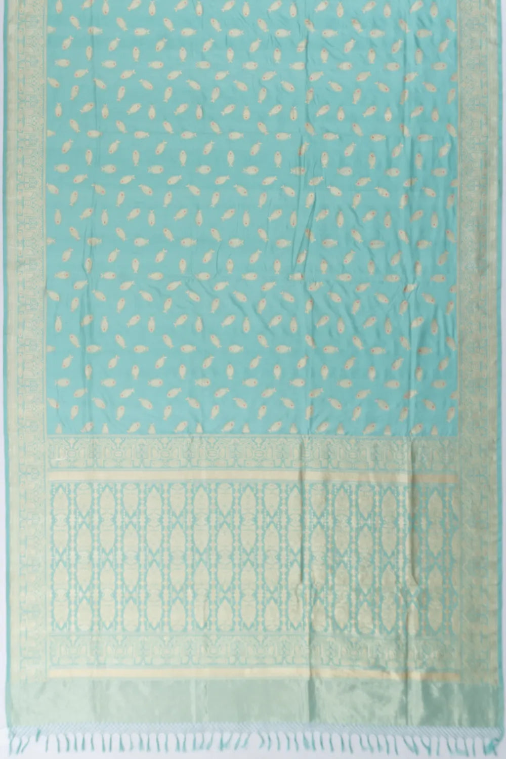 A serene pastel blue base adorned with exquisite gold zari fish motif Kadwa Buttas, brought to life with hints of meenakari detailing—symbolizing grace and prosperity.
