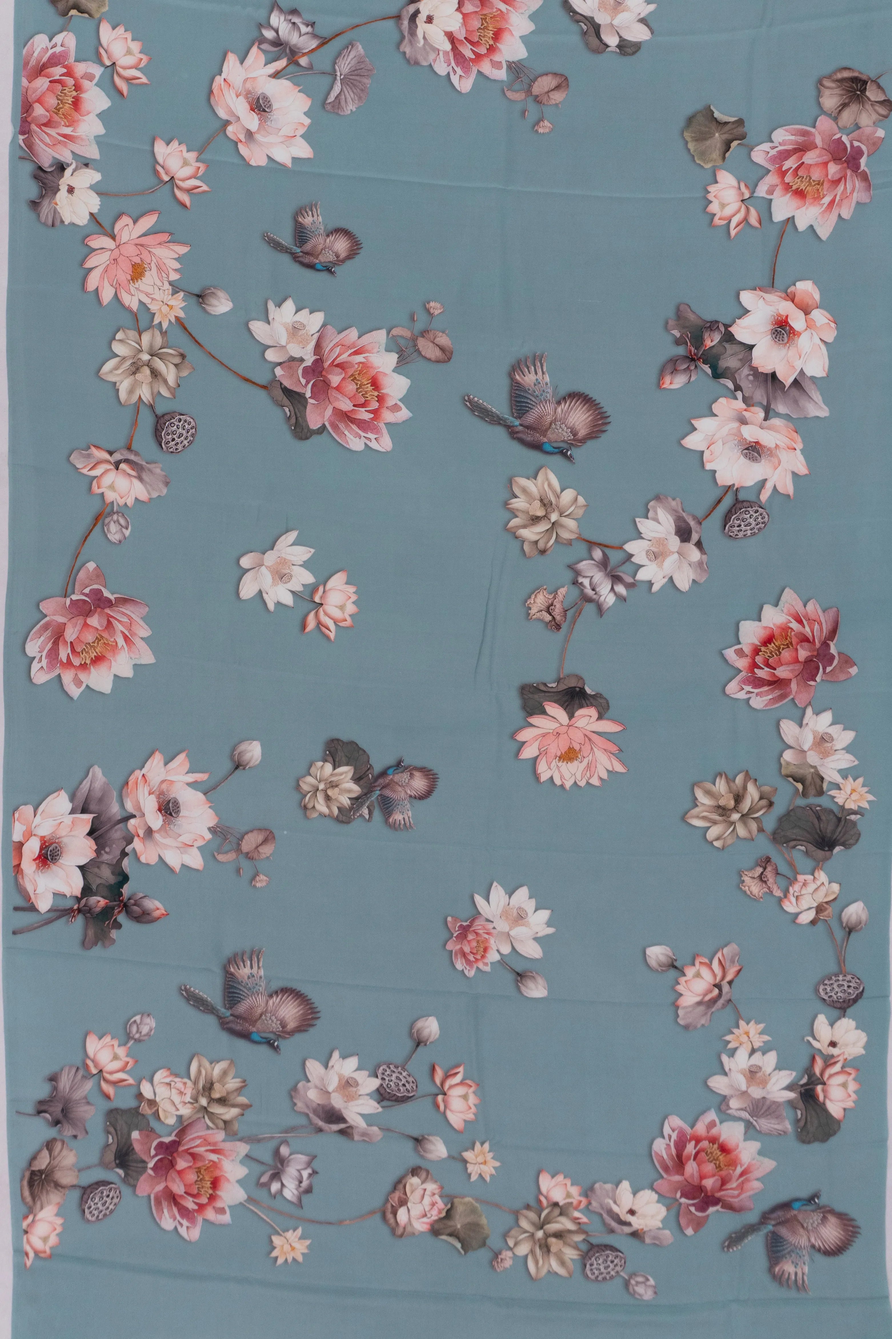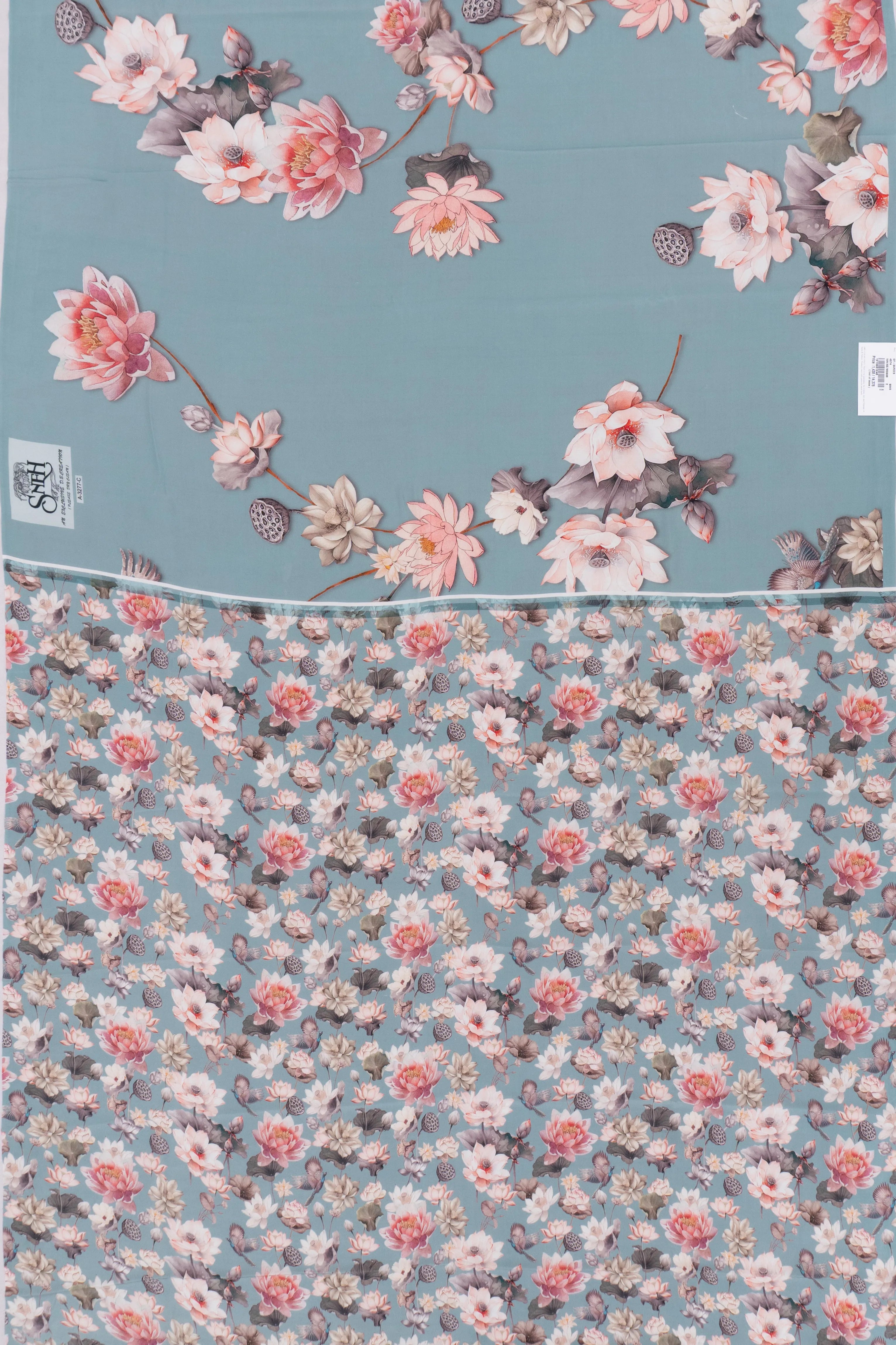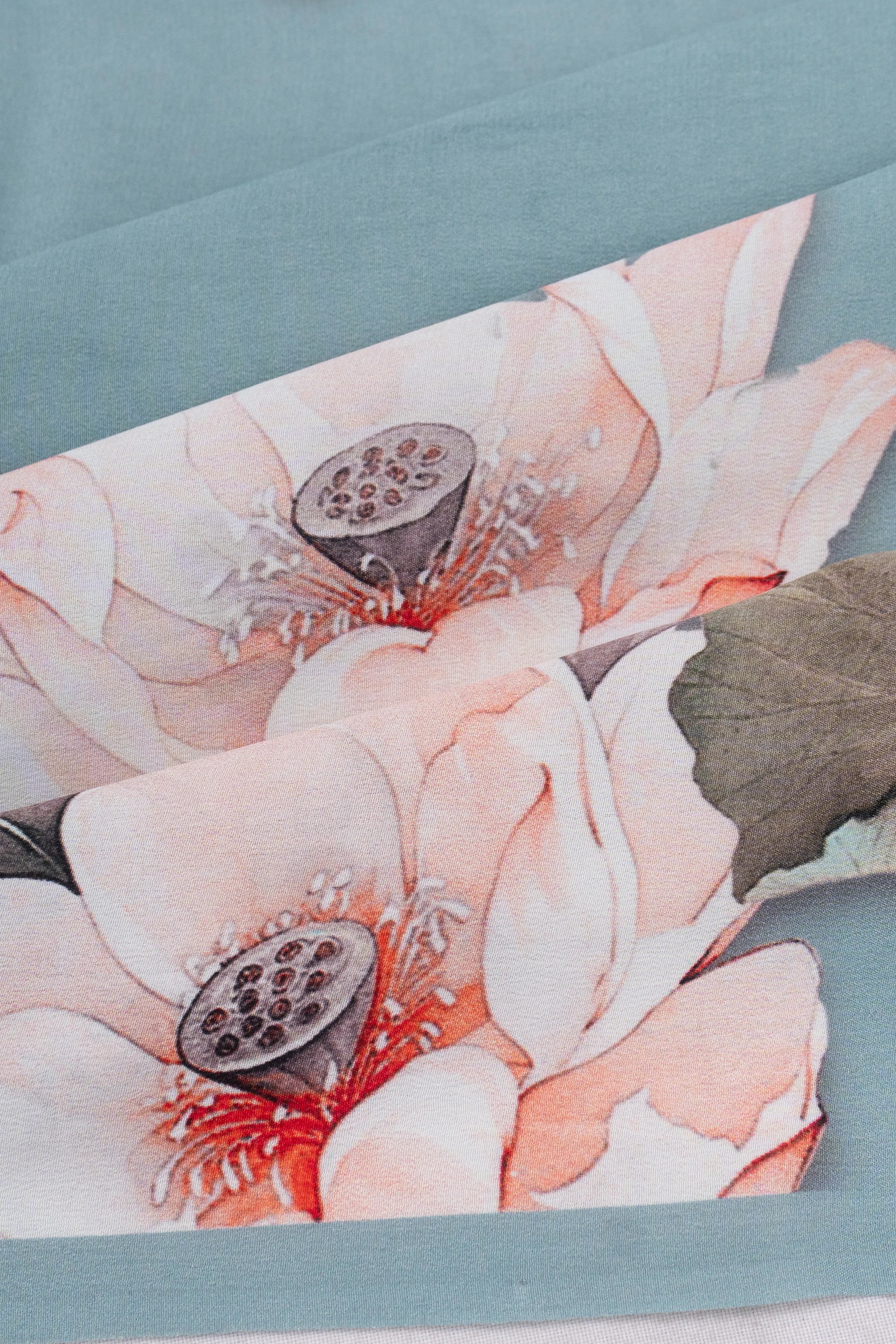 The saree's body is adorned with delicate floral prints that capture the essence of serene beauty against a soothing sage blue backdrop