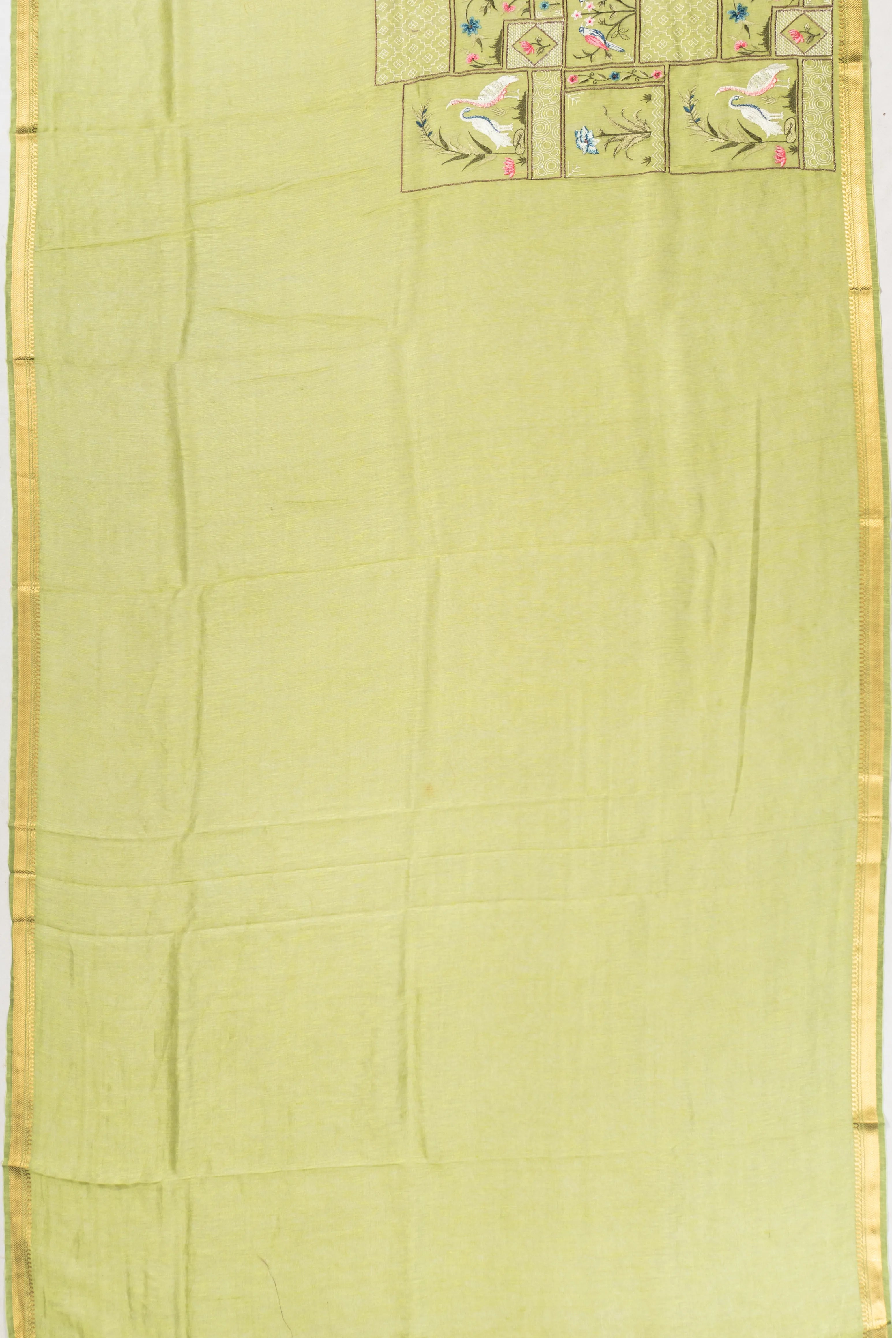 The saree is enhanced with a self-bordered gold zari brocade, adding a touch of regal allure to its vibrant green hue
