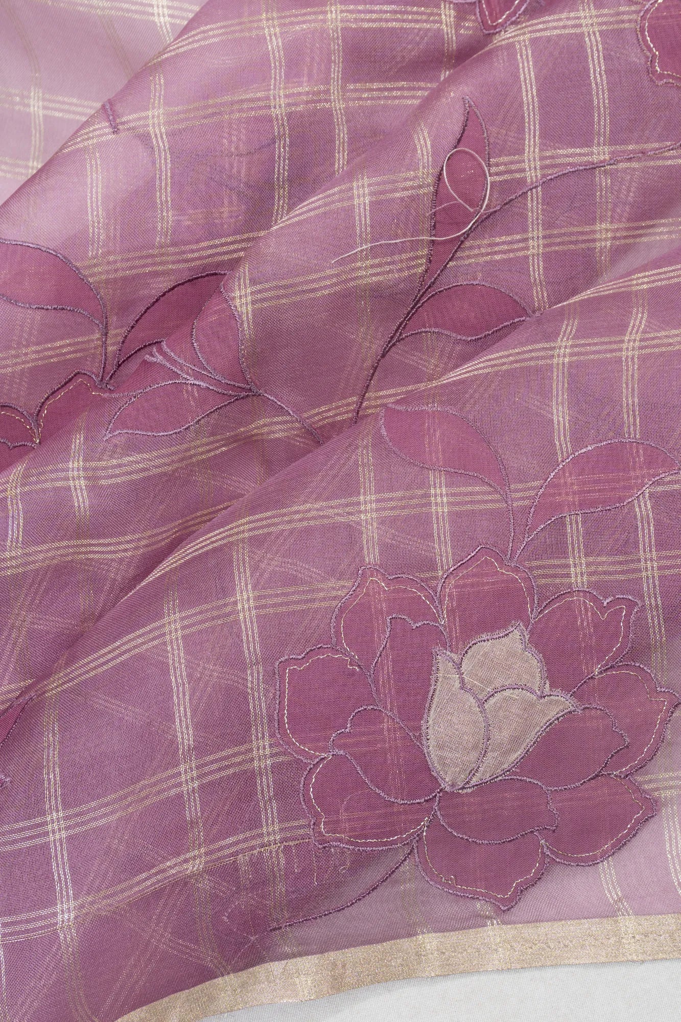 The saree's body is adorned with gold zari checks and intricate floral brocade, enhanced with delicate embroidery outlines that exude refined charm
