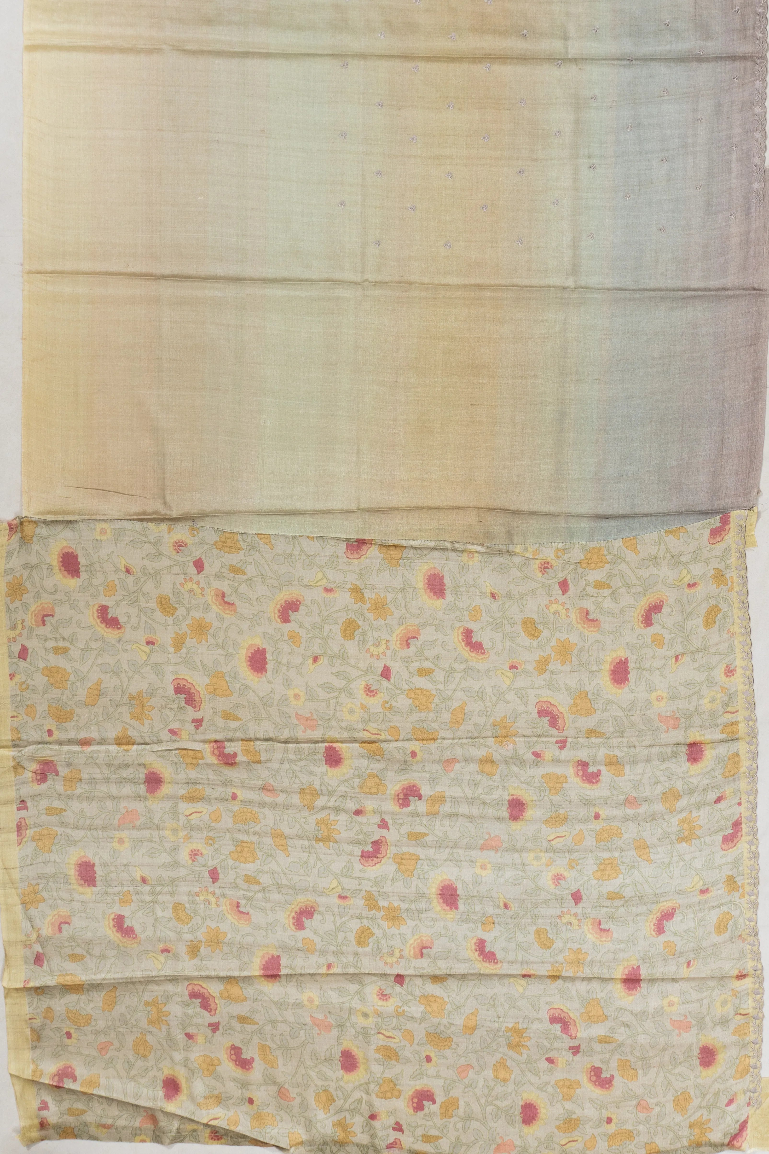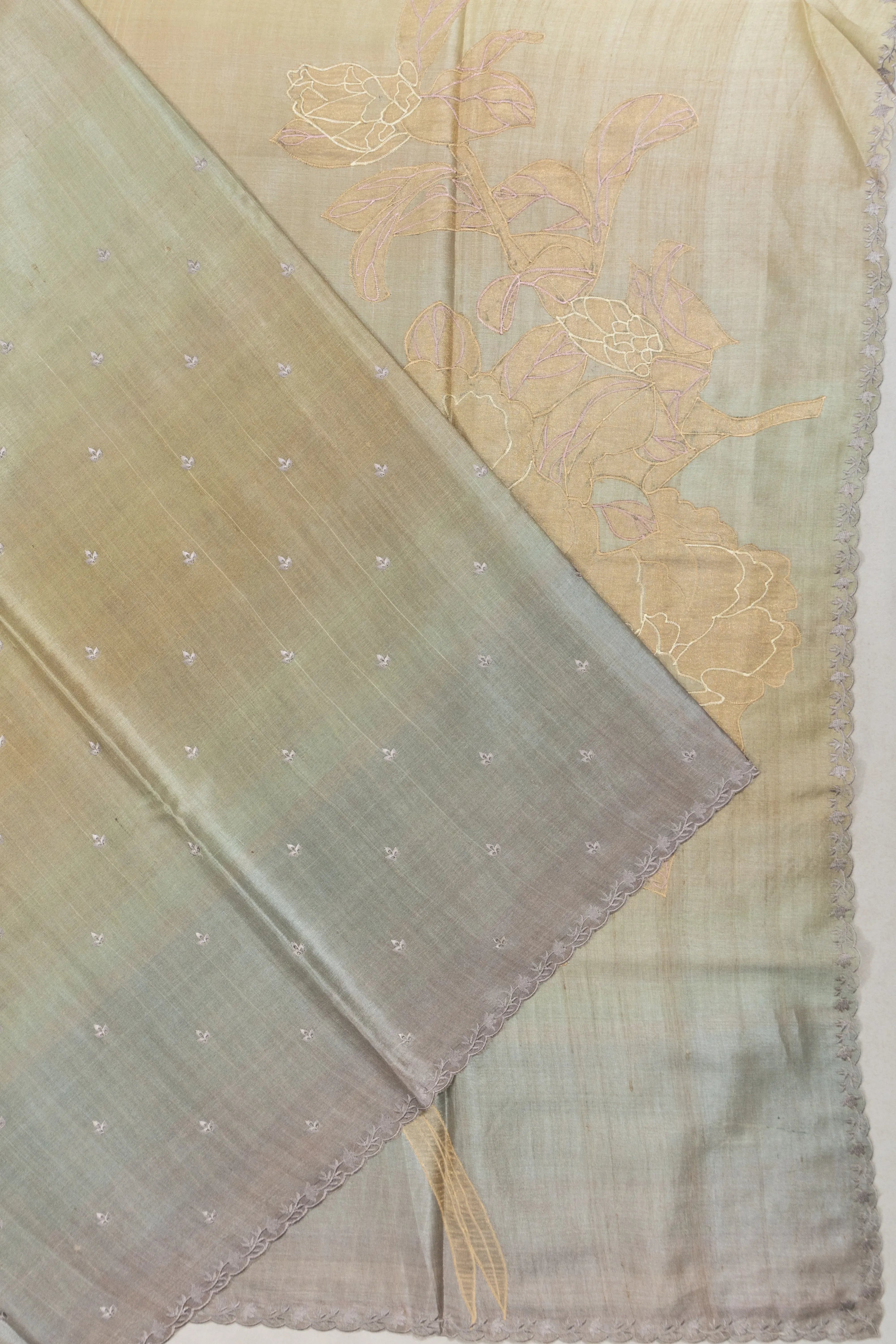 The body is adorned with silver zari flower buttas against a yellow shade dual tone, creating a subtle yet striking visual appeal