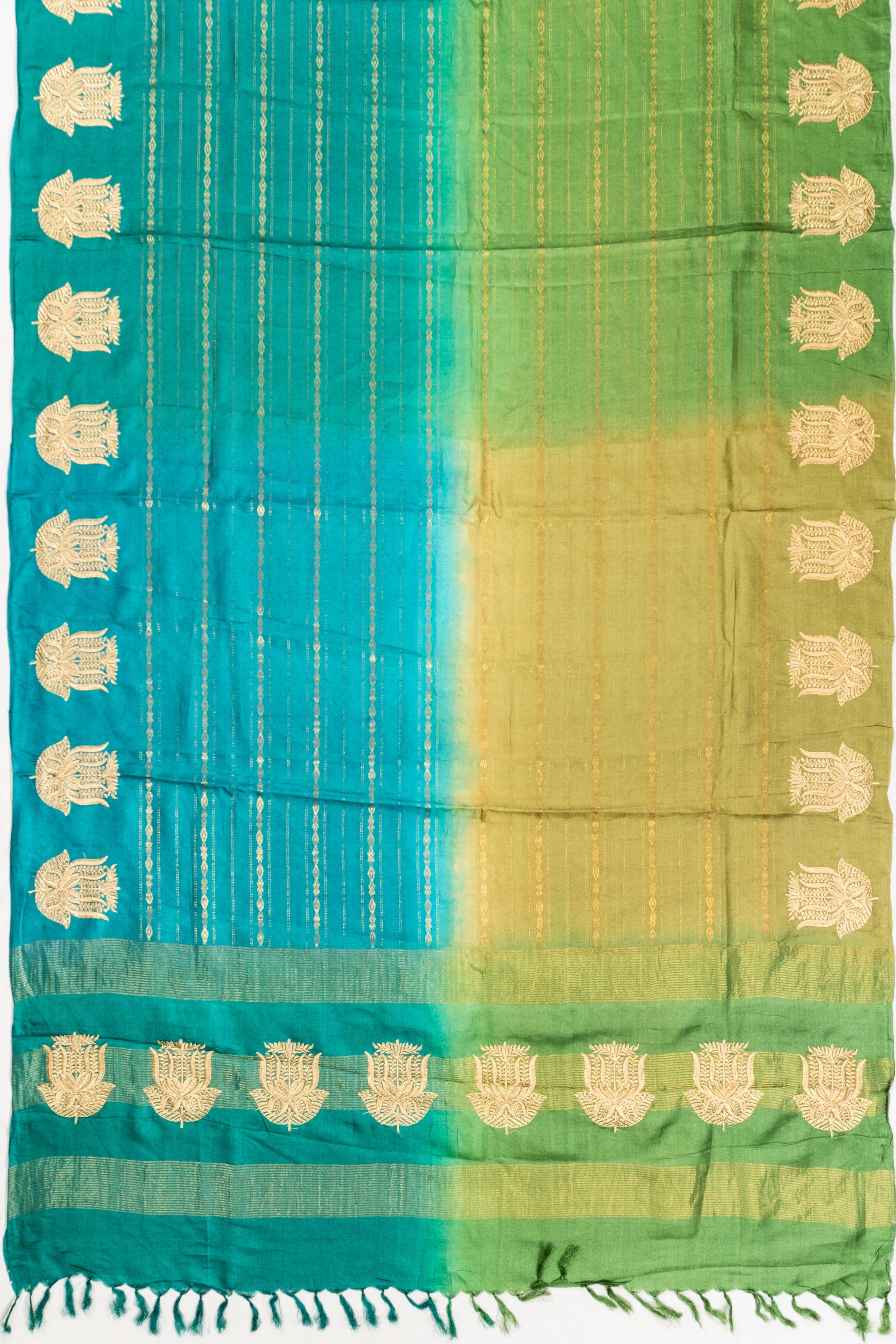 Paired with a sea green blouse, this saree finds harmonious balance in its gold zari flower butta and horizontal lines