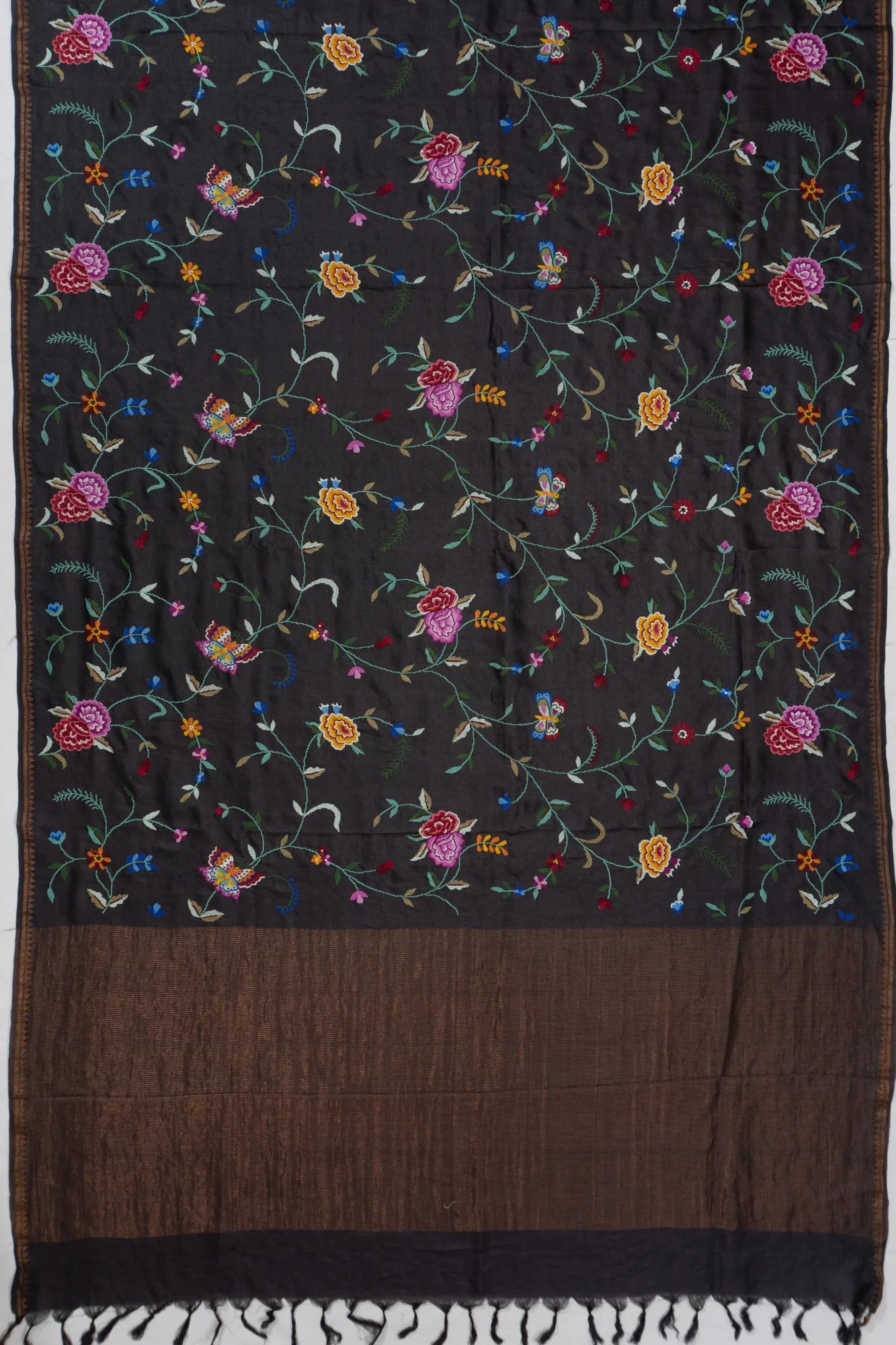 The saree's body is adorned with exquisite embroidered floral vines, creating a graceful tapestry of nature-inspired motifs that exude sophistication