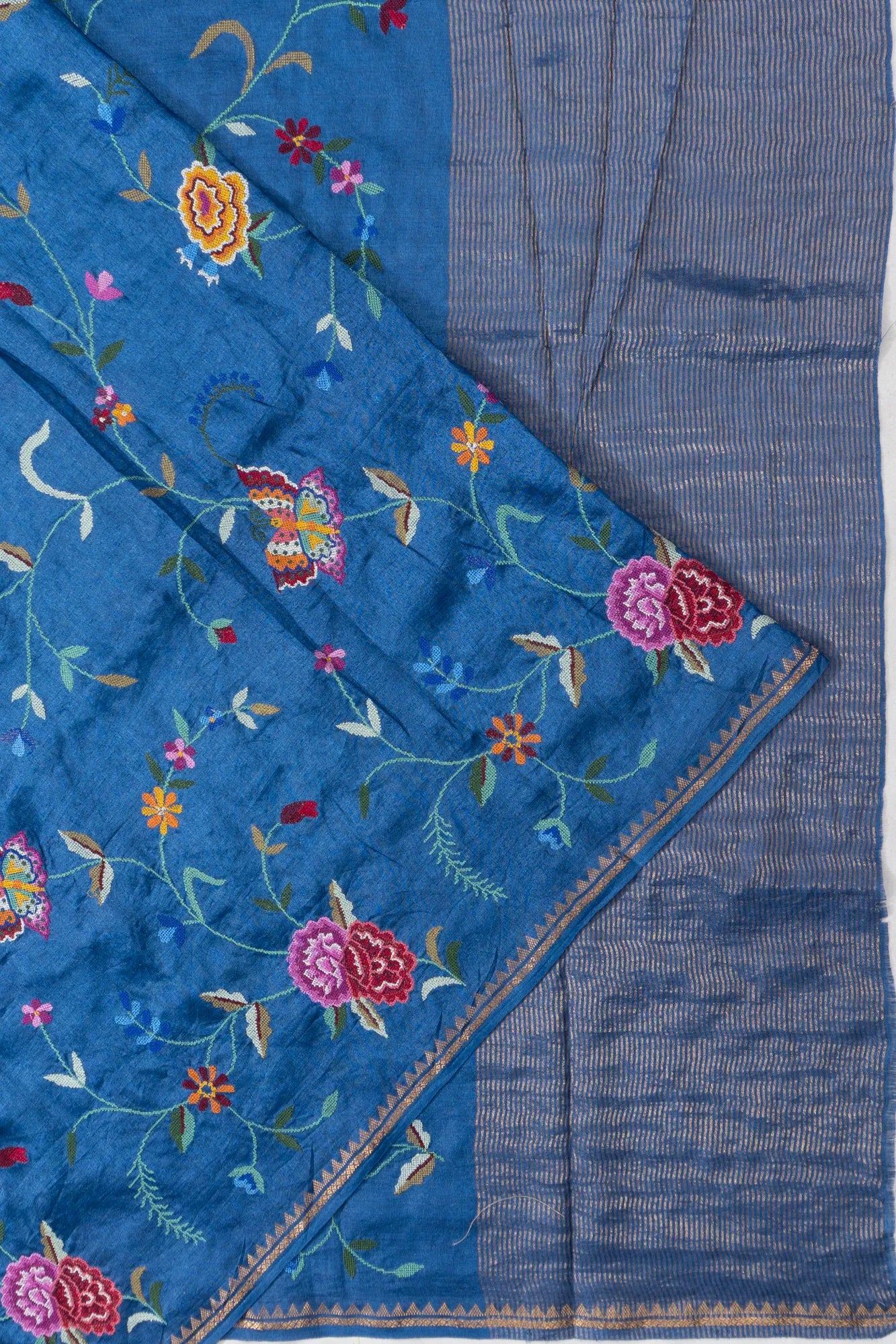 Paired with a coordinated blue blouse, embellished with embroidered flower buttas, this ensemble offers a seamless blend of tradition and style
