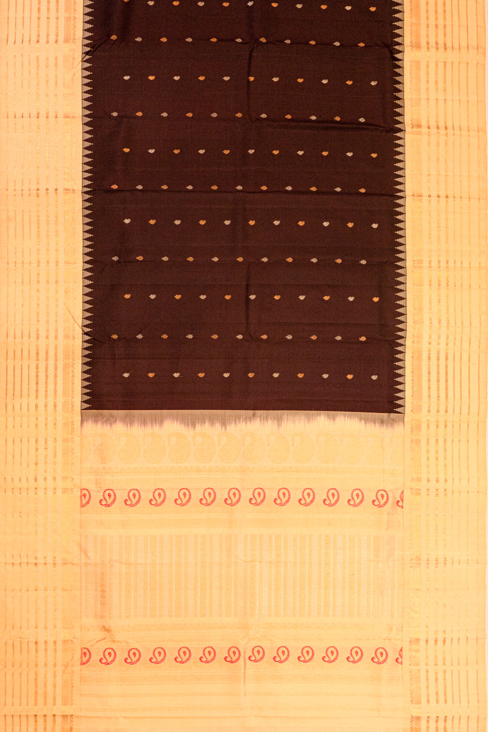 Framed by a cream temple border, the saree's medium-width edge features contrast gold zari horizontal lines, adding a touch of regal distinction