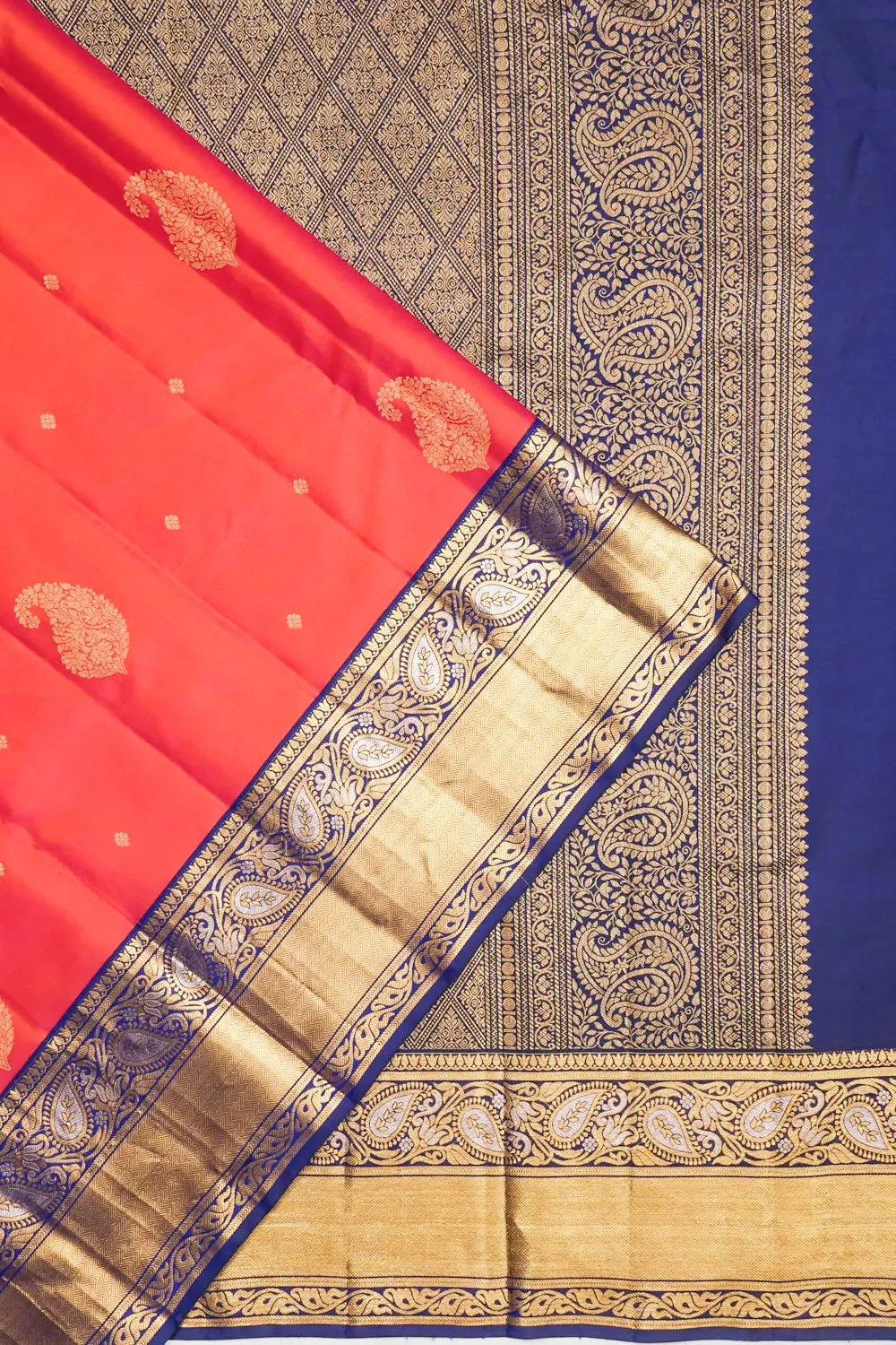 The pallu, with its harmoniously contrasting design, showcases gold zari paisley motifs and diamond butta brocade, completing the saree with graceful detail