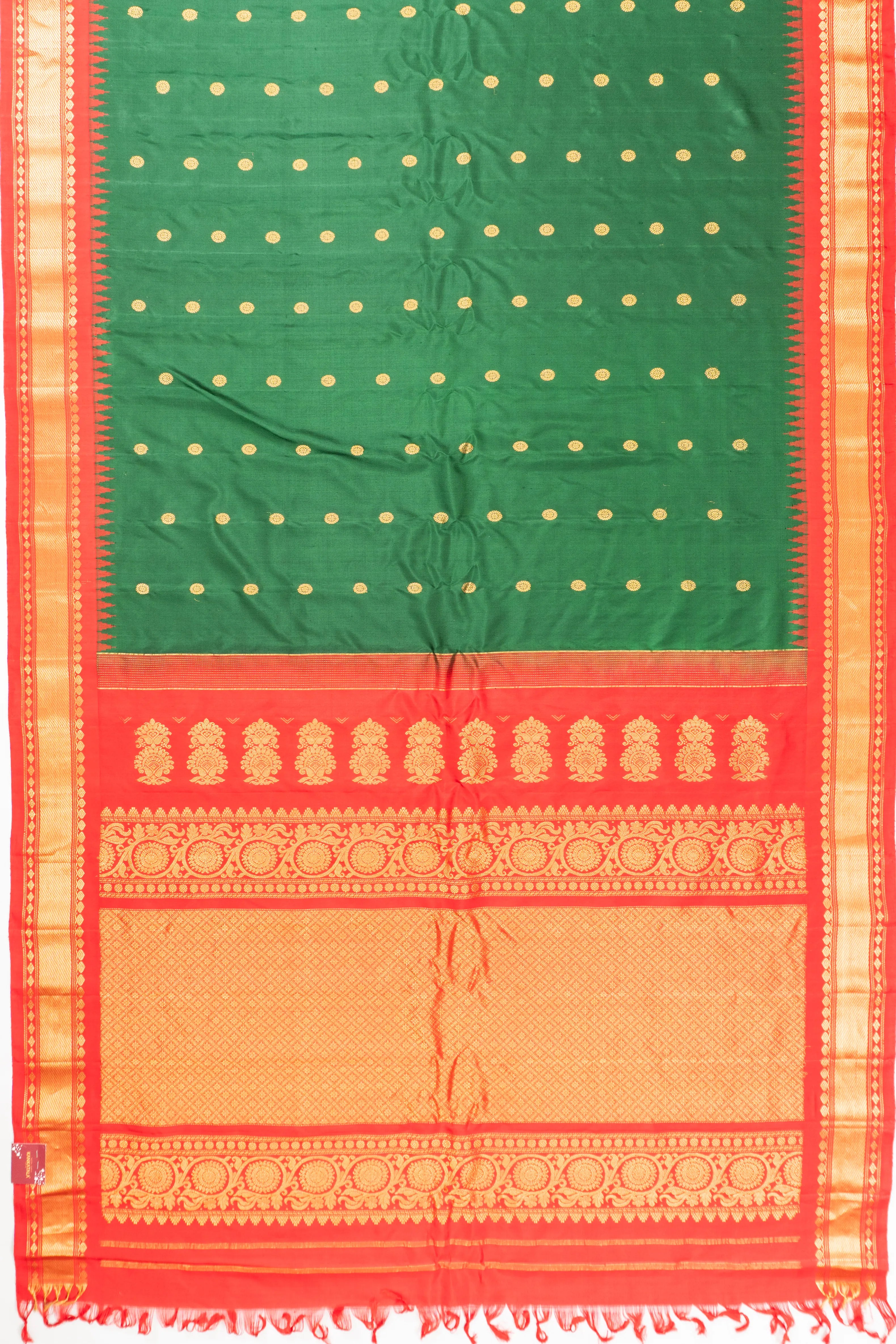 The rich, dark green body exudes sophistication, adorned with delicate butta motifs that speak of timeless artistry