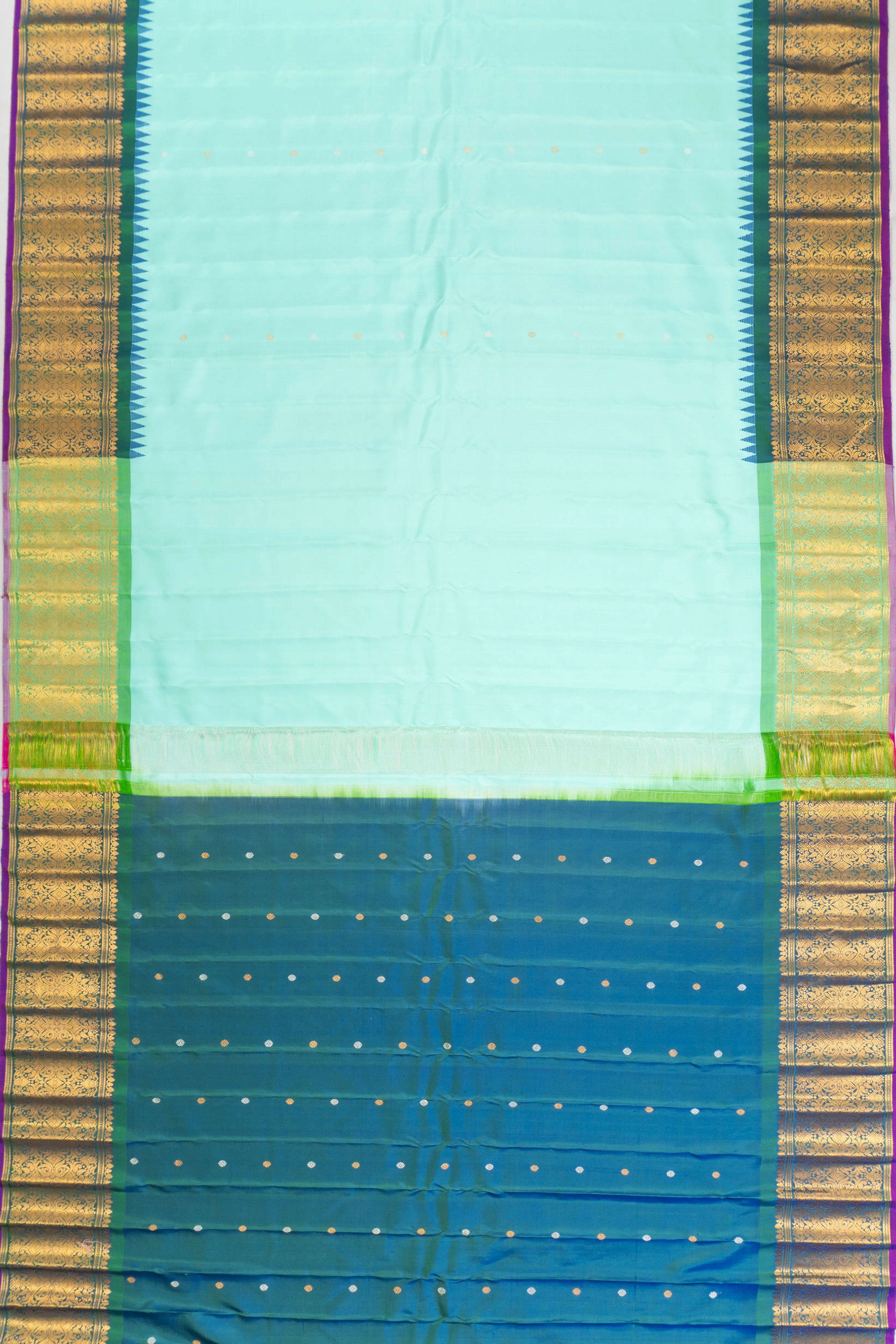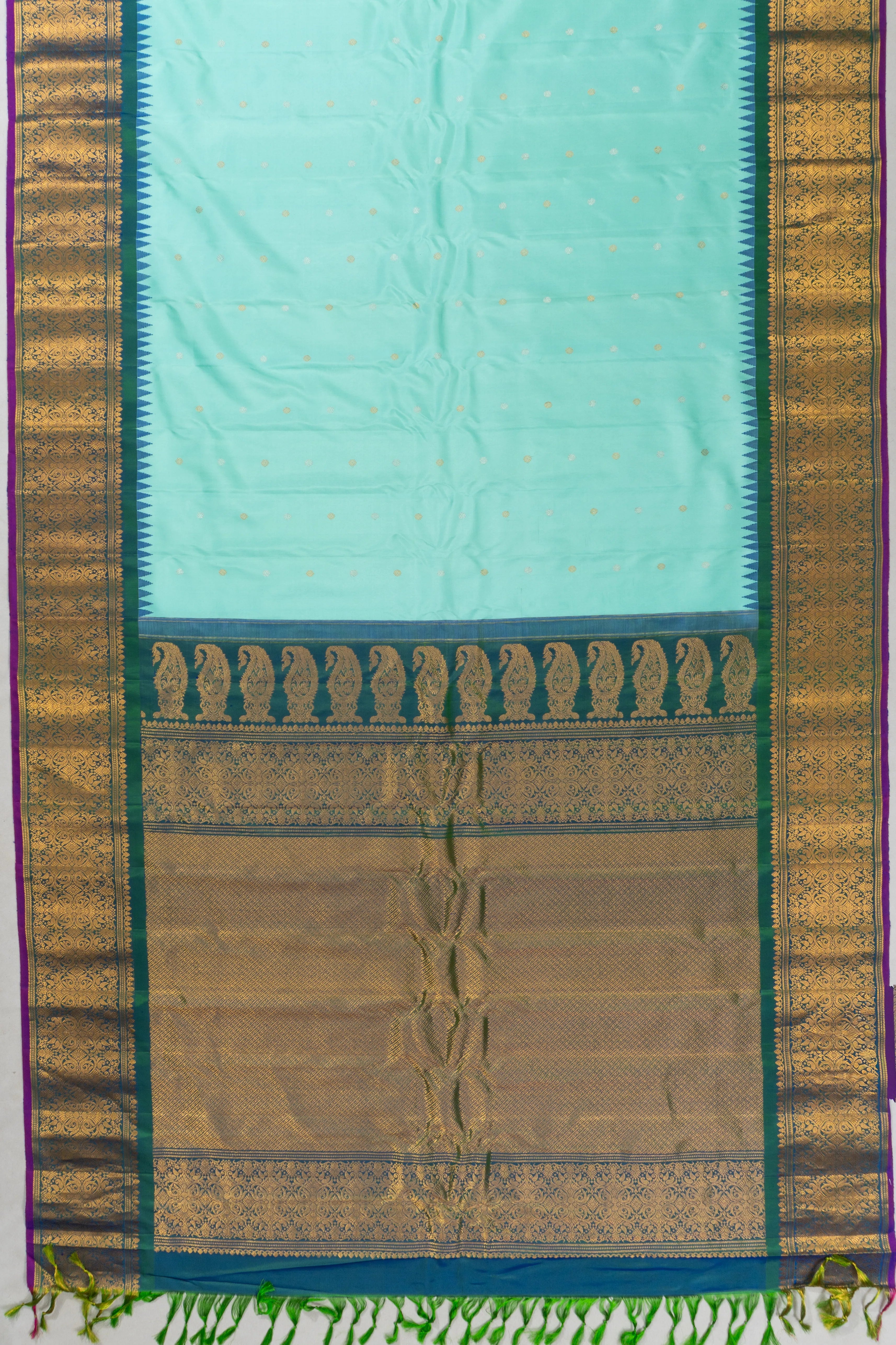 The saree is beautifully complemented by a medium green border highlighted with exquisite gold zari work, adding a touch of opulence to the ensemble