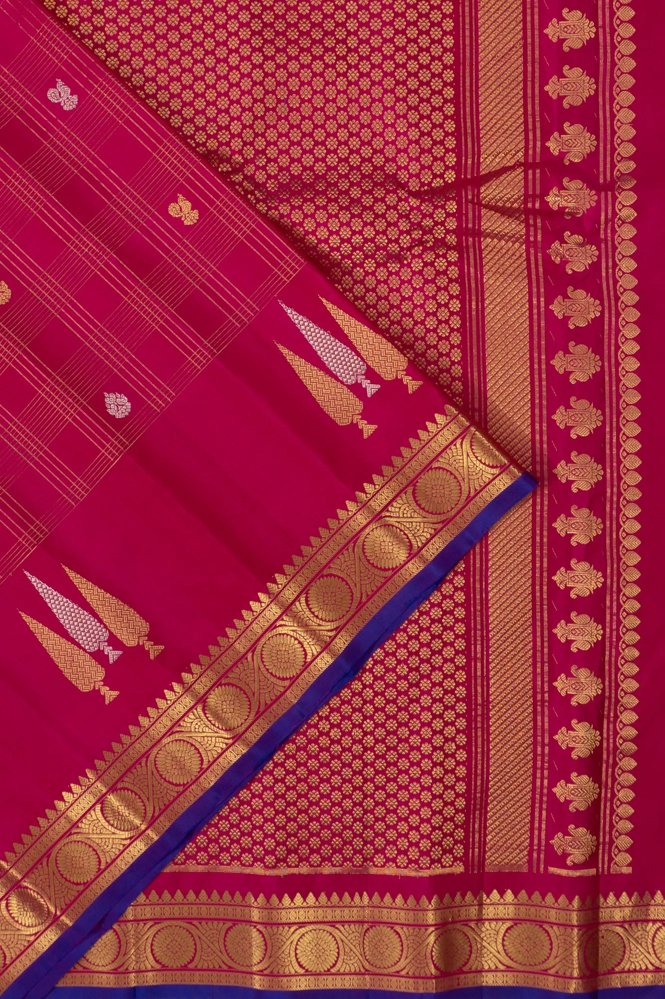 The body is adorned with gold zari checks, beautifully interspersed with gold and silver zari peacock motifs and floral buttas, creating a tapestry of elegance