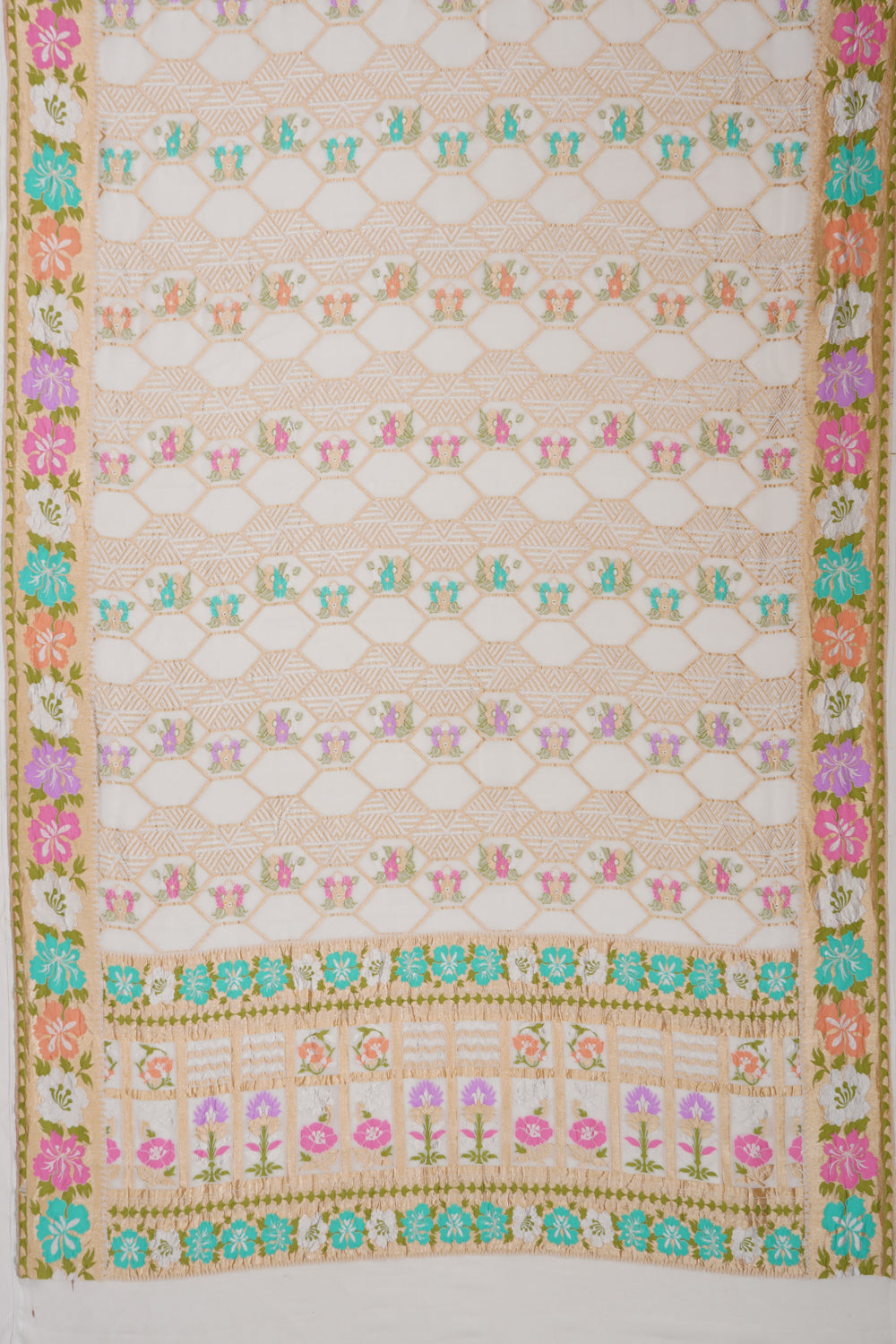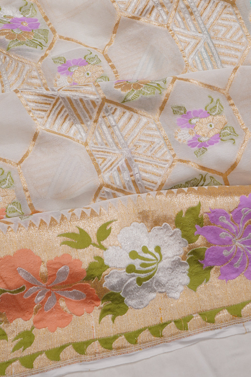 The saree features a subtle, yet sophisticated, self border with gold and silver zari floral vines, offering a harmonious touch that enhances its classic appeal