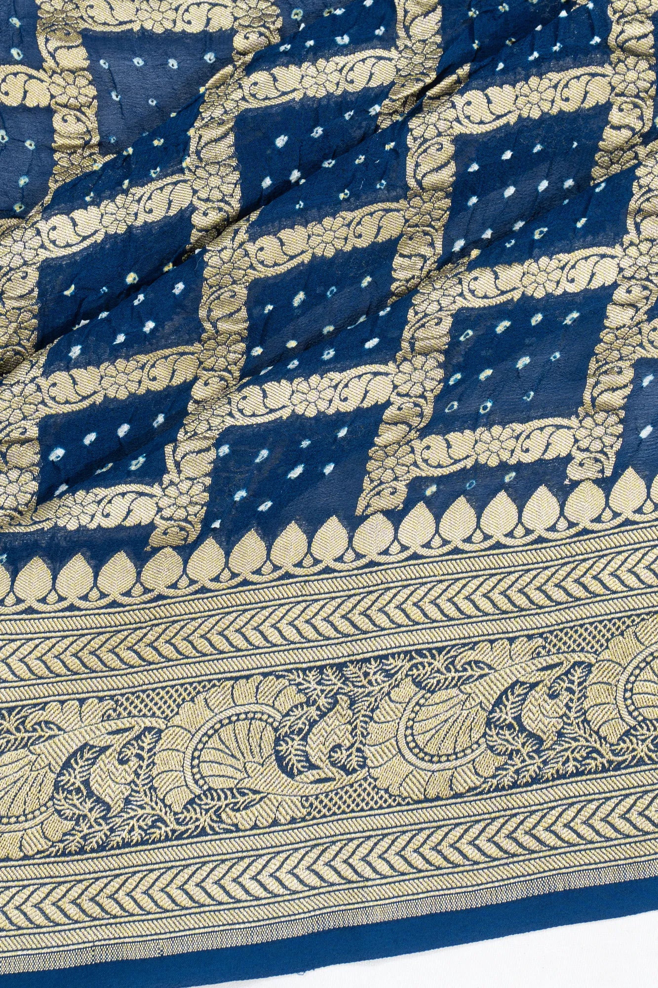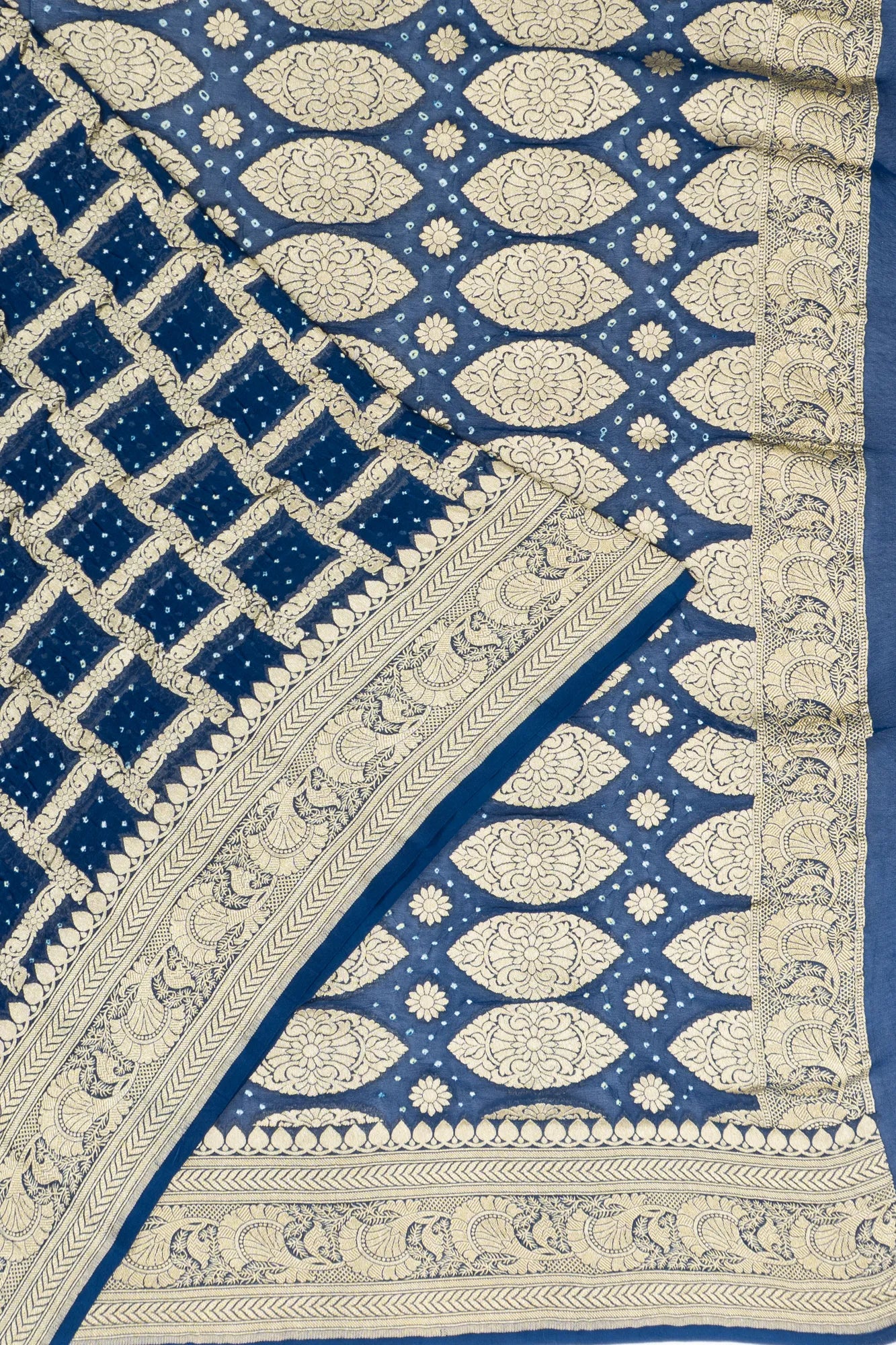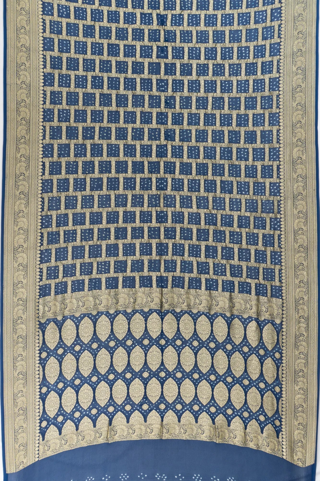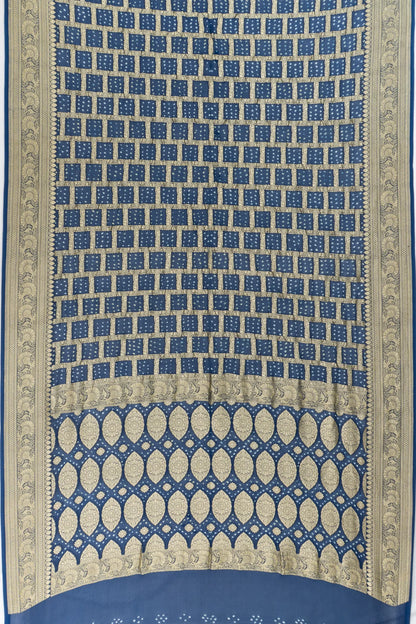 The deep dark blue base is adorned with gold zari checks interspersed with traditional Bandhani patterns, blending classic craftsmanship with elegant design.