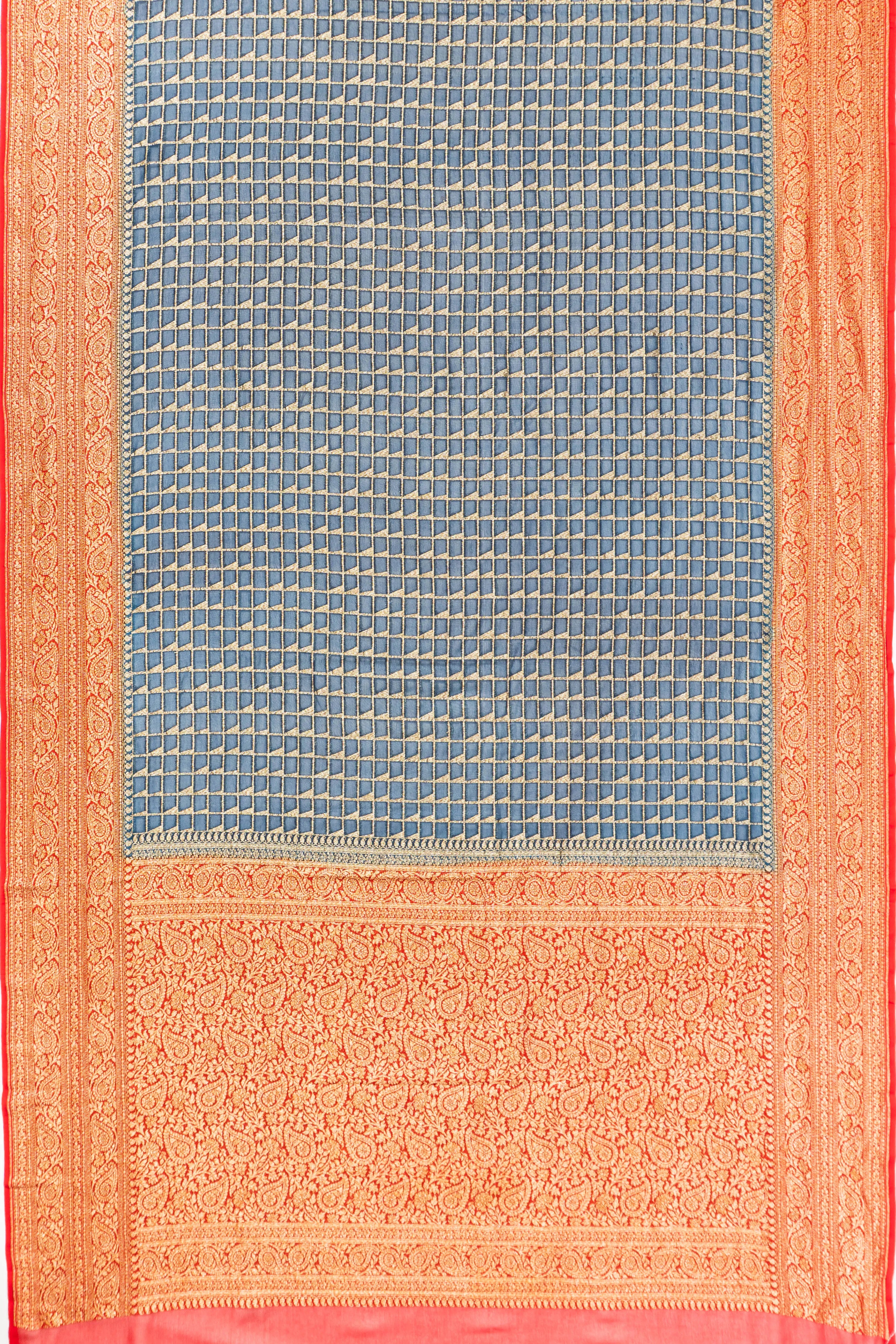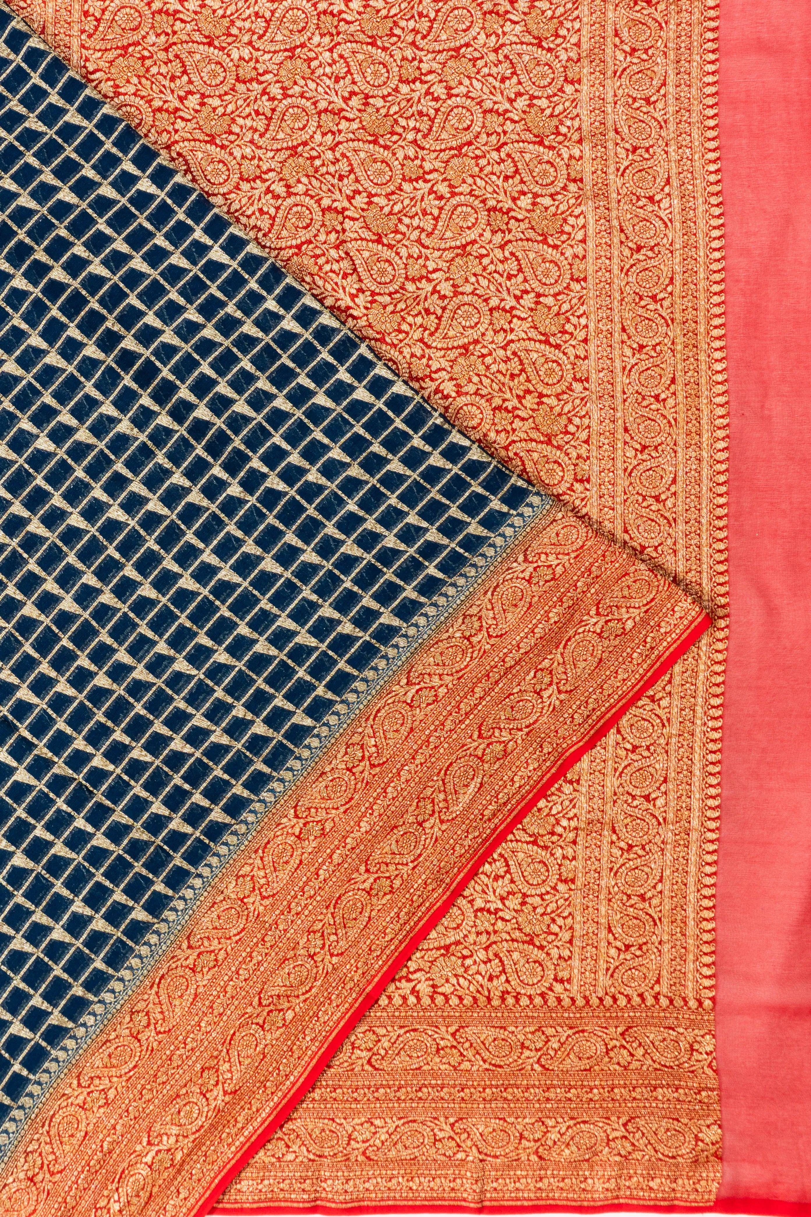 The body is adorned with gold zari checks, exuding a subtle shimmer that speaks of heritage and craftsmanship