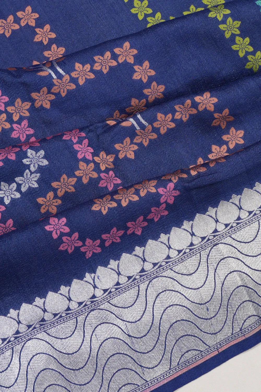 The saree's body showcases the rich texture of tussar silk, beautifully enhanced by the opulence of silver zari brocade, imparting a regal allure