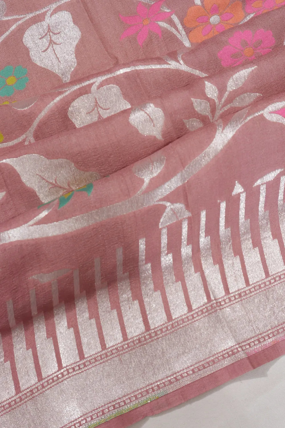 Its border features a self peach hue, accentuated by a subtle silver zari kaddi, providing a delicate yet striking frame to the saree