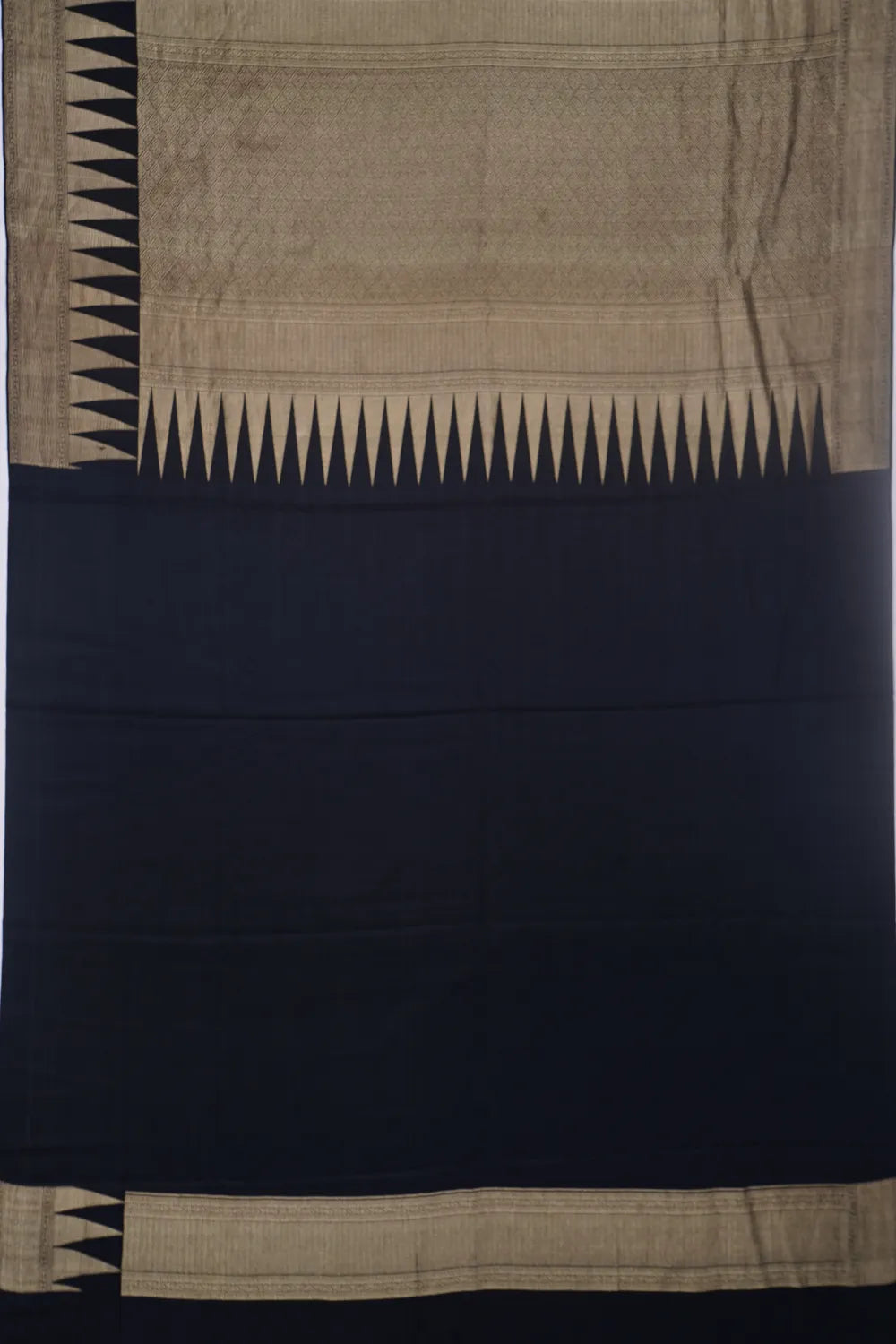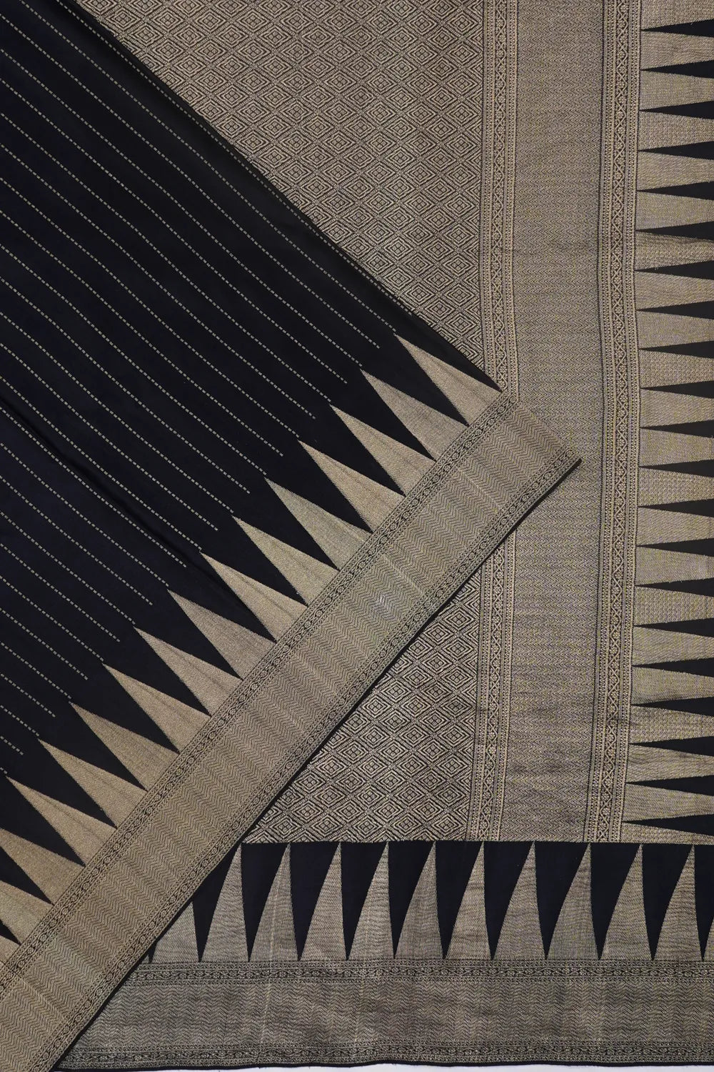 The saree features a small border With self gold zari zig-zag lines and temples, adding a subtle yet striking detail to the ensemble