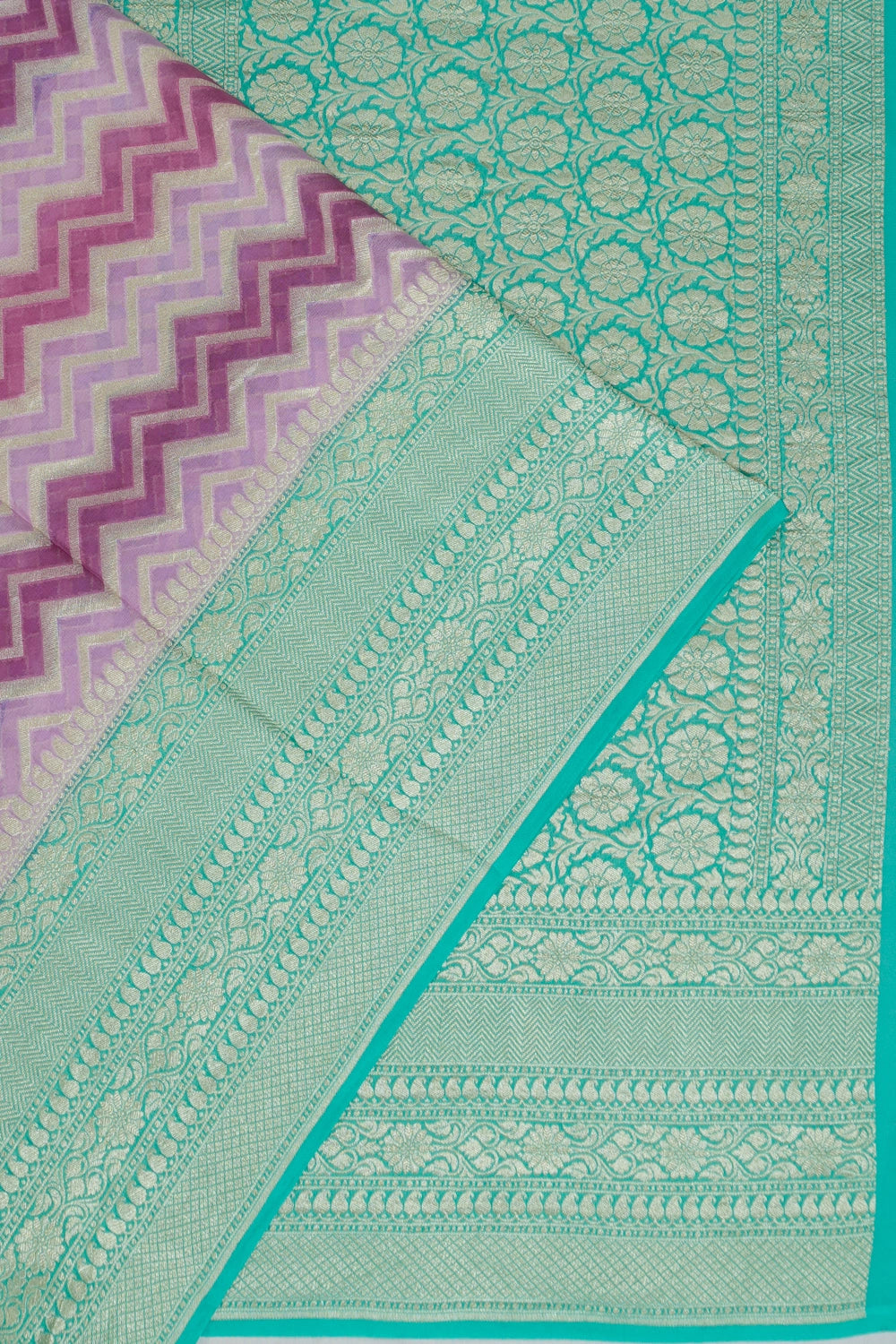 The saree's body is a beautiful tapestry of rich purple, exuding sophistication and grace, while the contrast zari brocade border adds a touch of opulence with its delicate gleam