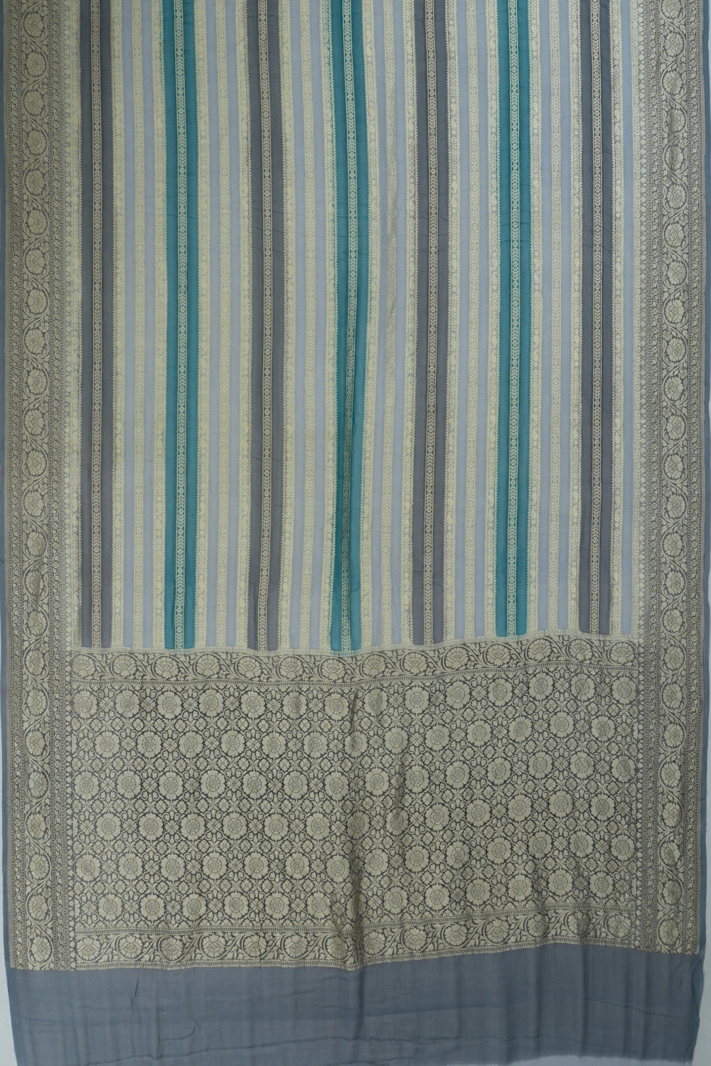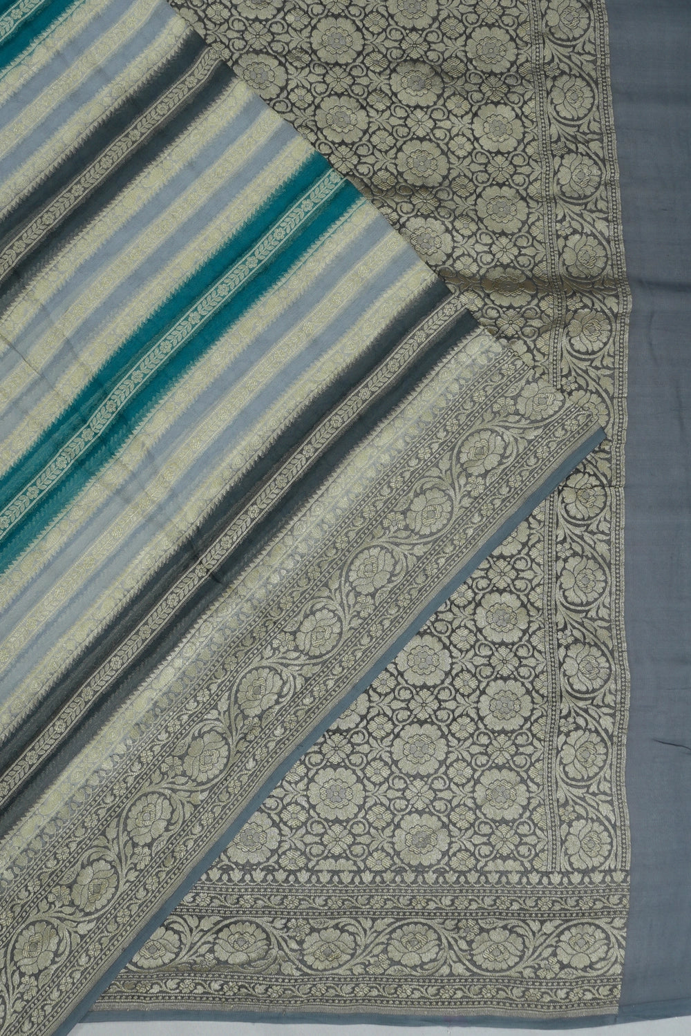 Paired with a coordinated plain grey blouse, this saree is an ideal choice for those who appreciate the delicate interplay of silk and zari, perfect for a sophisticated occasion or a cherished celebration