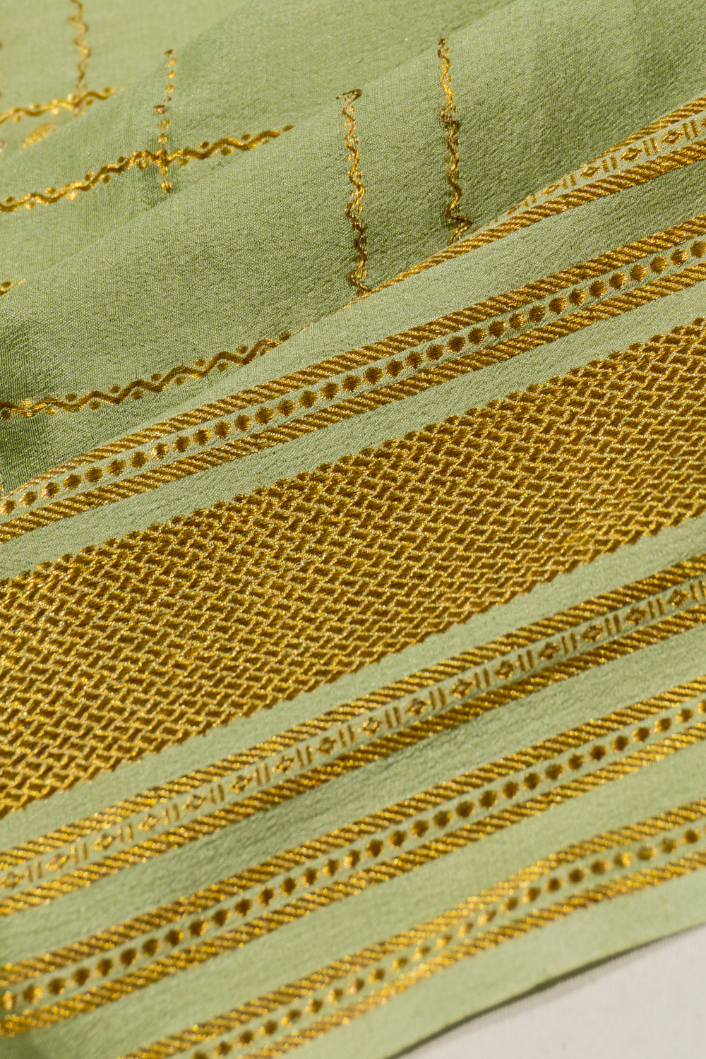 Georgette is typically a plain weave. It is woven using crepey twisted yarns. Plain georgette saree is versatile, easy to drape and maintain, and comfortable to move around in. The crepey-like twists create slight wrinkles on the surface of the fabric.