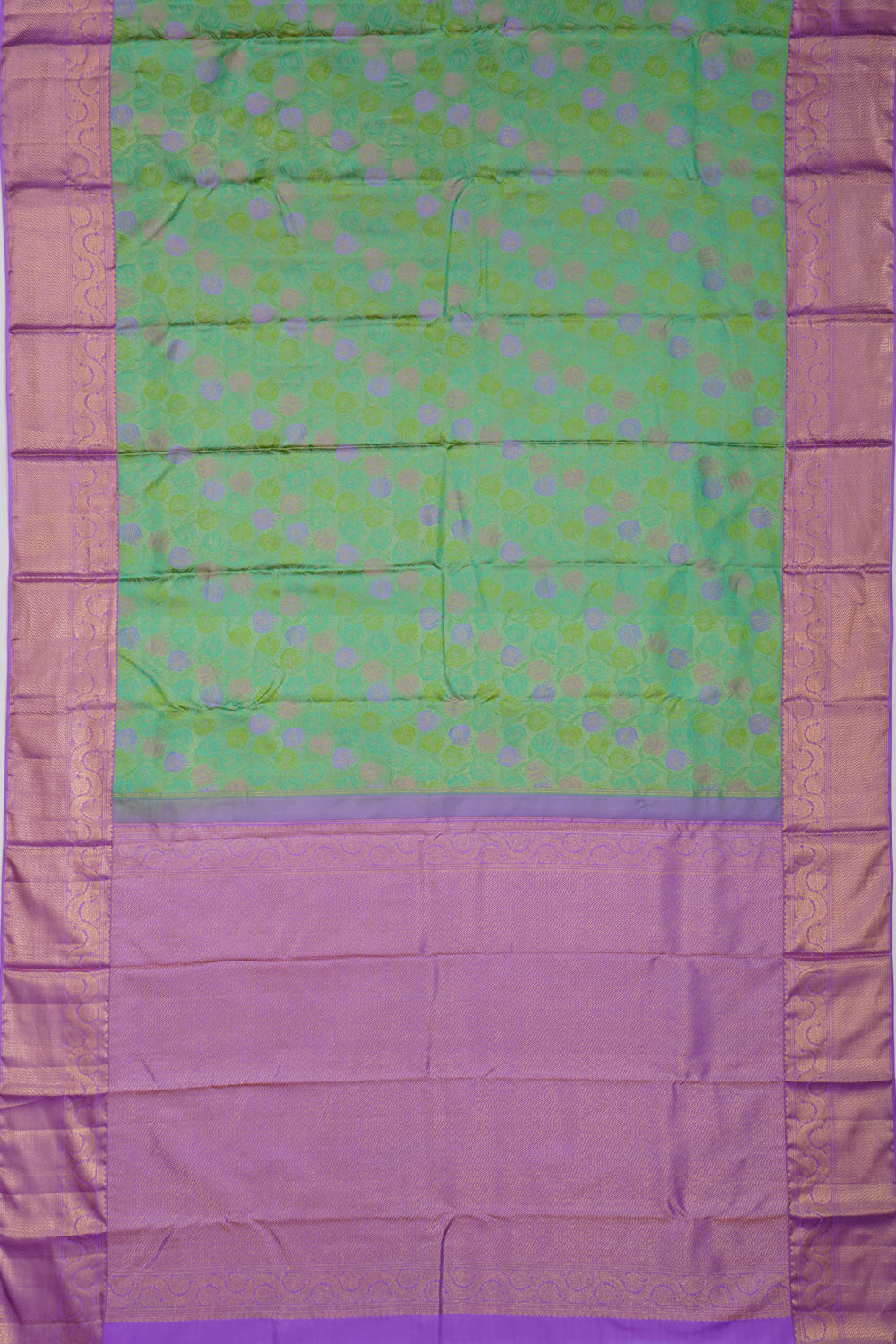 Embrace the allure of tradition with the Taranga Kanchi Silk Brocade Green Saree, a masterpiece in heritage-rich silk The vibrant green body is enhanced with a contrast gold zari lavender border, adding a touch of regal elegance to your ensemble