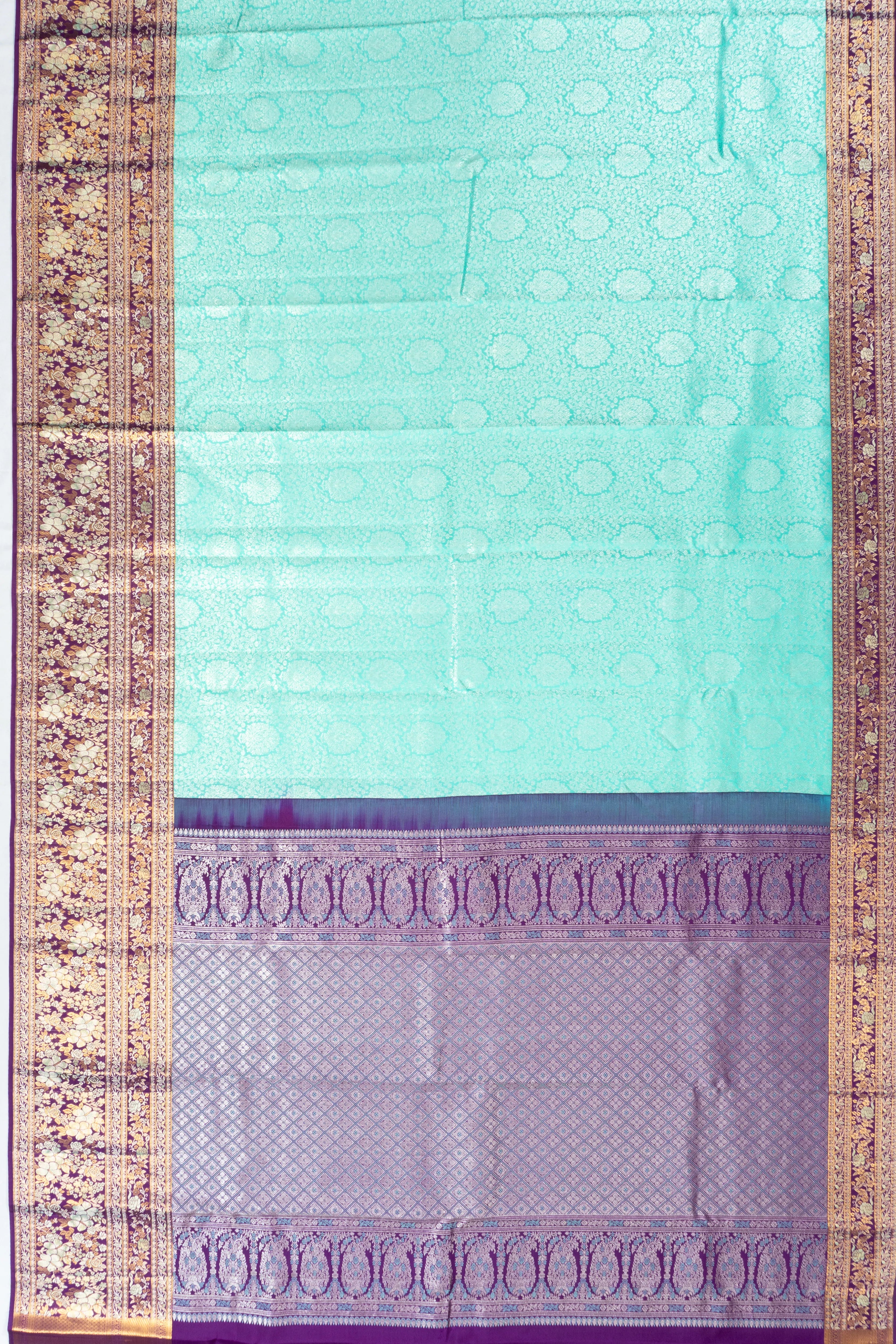 The sea green body is adorned with silver zari floral brocade, exuding a serene yet opulent charm that captures the essence of traditional artistry