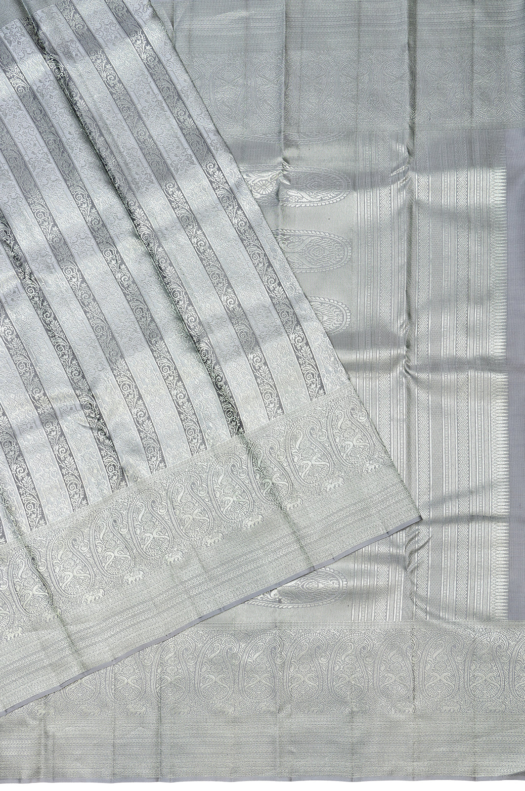 The medium border is enriched with self gold zari, showcasing majestic peacock and elephant motifs intertwined within floral vines, adding a layer of intricate beauty